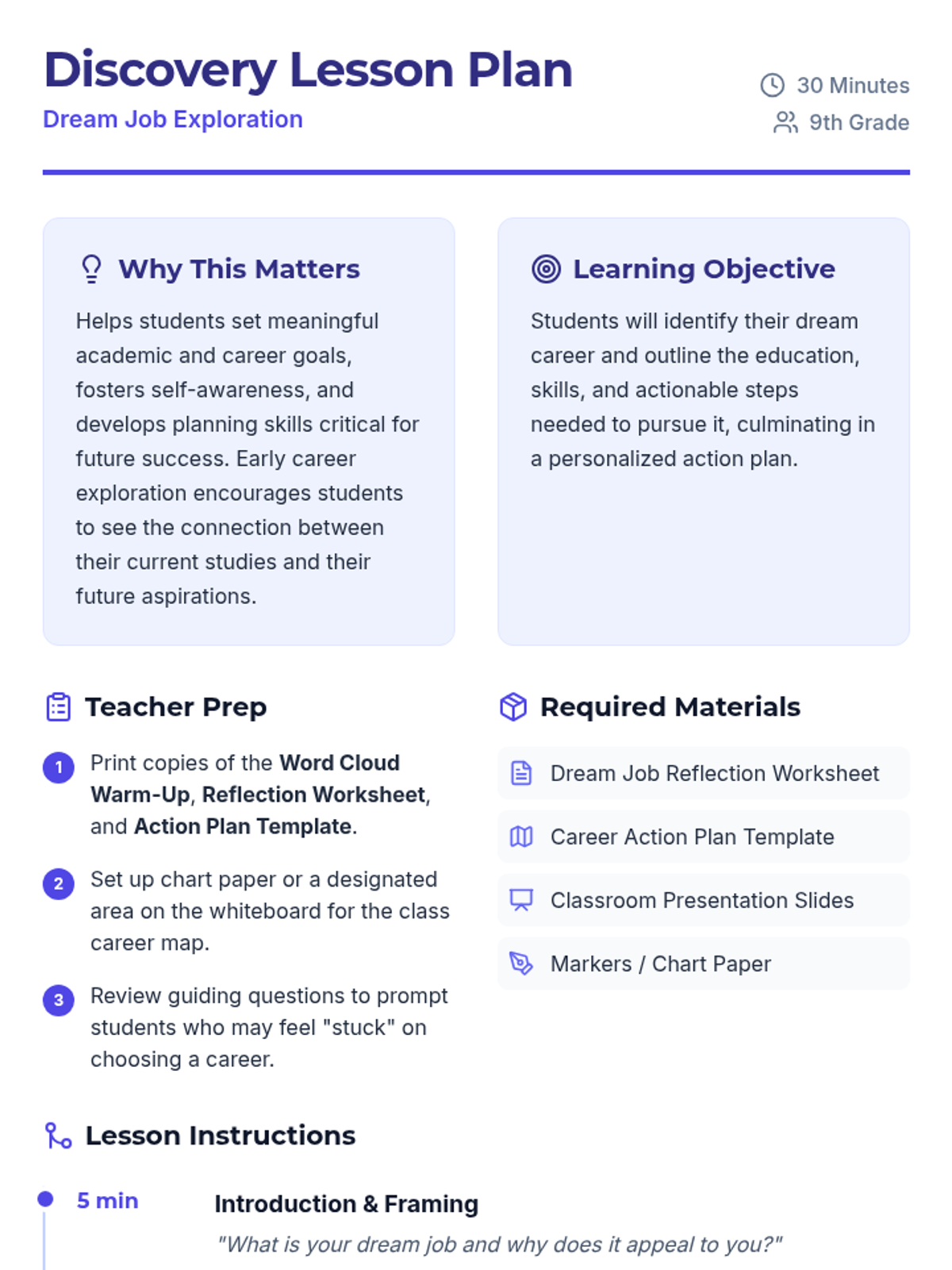 A comprehensive career readiness unit for 9th-grade students that guides them from initial self-discovery and goal setting to understanding the practical tools of professional life, such as resumes and action plans.
