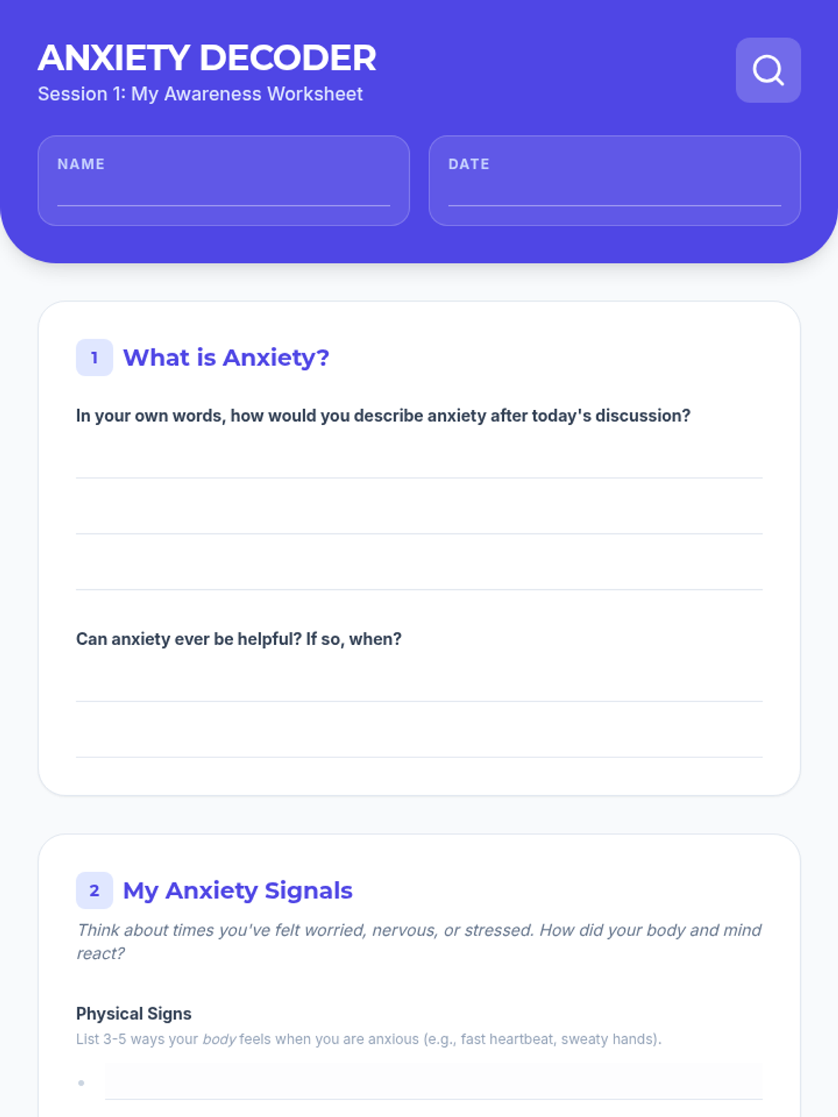 An 8-session individualized Tier 3 intervention series designed for 9th-grade students. This program transforms students into 'Anxiety Alchemists' by teaching them to understand, decode, and manage anxiety through practical coping strategies, cognitive reframing, and resilience building.