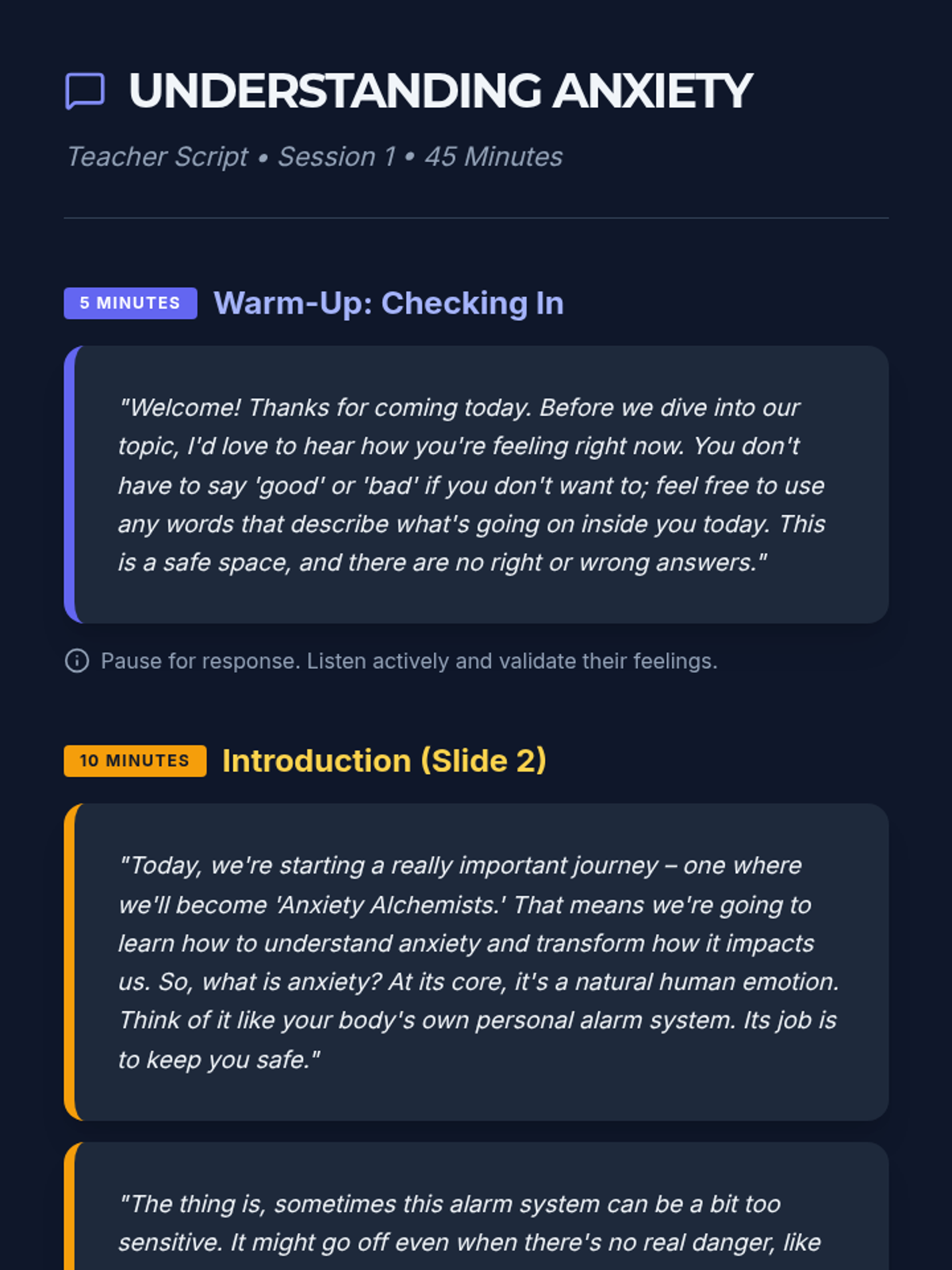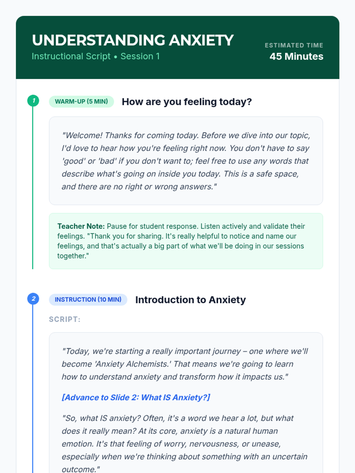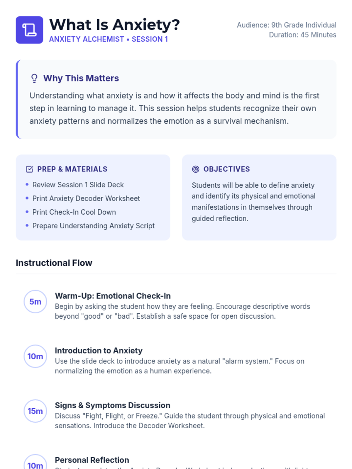 An 8-session individualized lesson series designed for 9th-grade students to understand and manage anxiety. Through the metaphor of alchemy, students learn to transform anxiety into resilience using practical tools like breathing, grounding, cognitive reframing, and problem-solving.