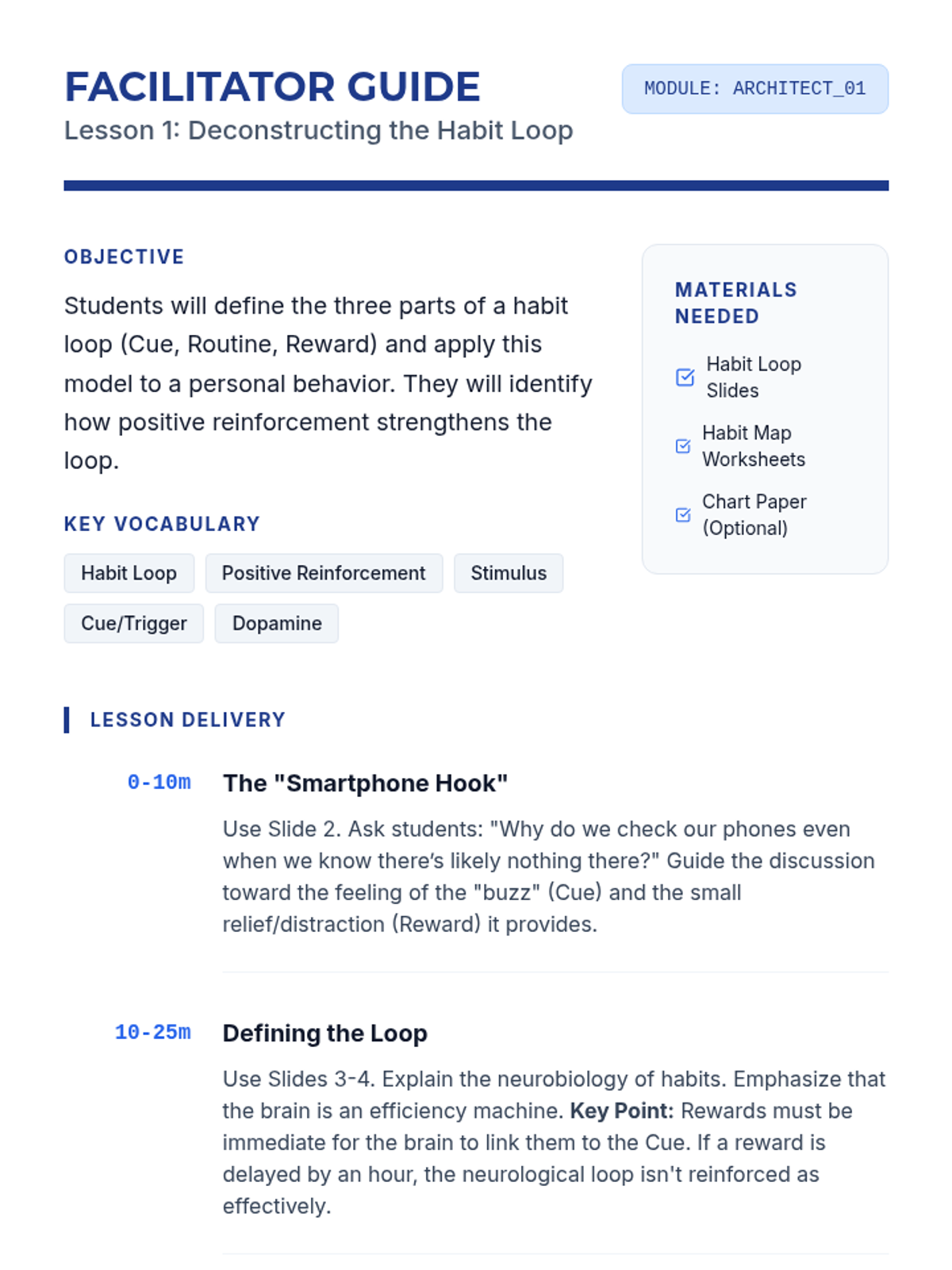 A high-impact 5-lesson sequence designed for credit-deficient high school sophomores to reclaim their academic path. The curriculum reframes impulse control as a strategic 'power move' for achieving independence, career success, and graduation through cognitive discipline and environmental awareness.
