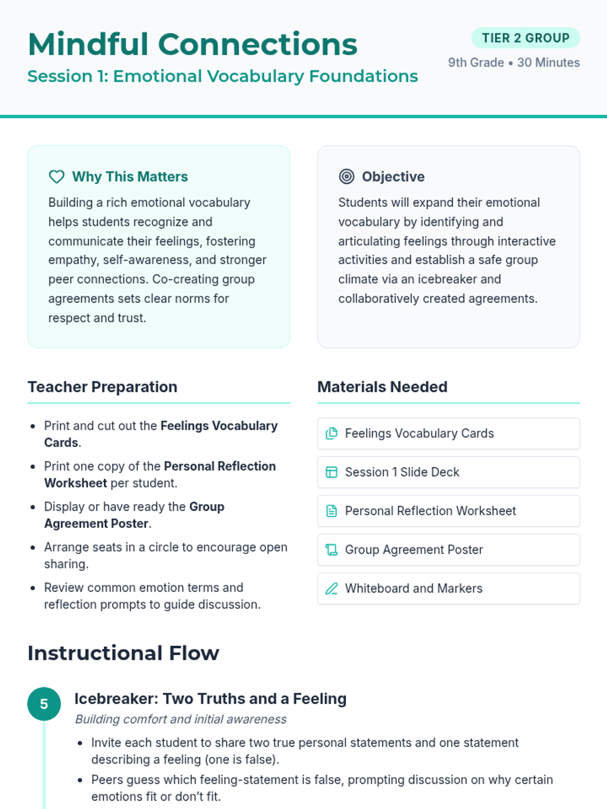 A 5-session Tier 2 small-group program for 9th graders designed to develop emotional intelligence, empathy, active listening, and conflict resolution skills through interactive practice and reflection.