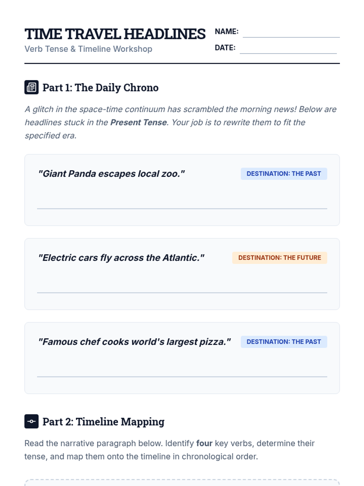 This workshop-style sequence focuses on the nuanced use of perfect and progressive verb tenses to control narrative time and sequencing in advanced writing. Students analyze non-linear narratives, practice sentence combining with perfect aspects, and explore the atmospheric effects of progressive forms to master narrative clarity.