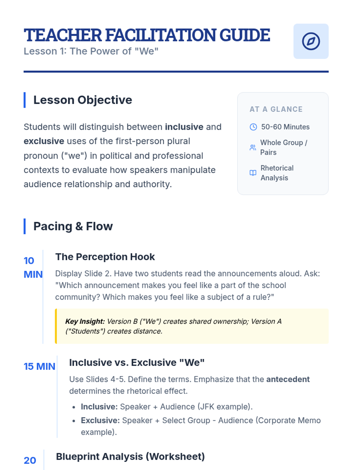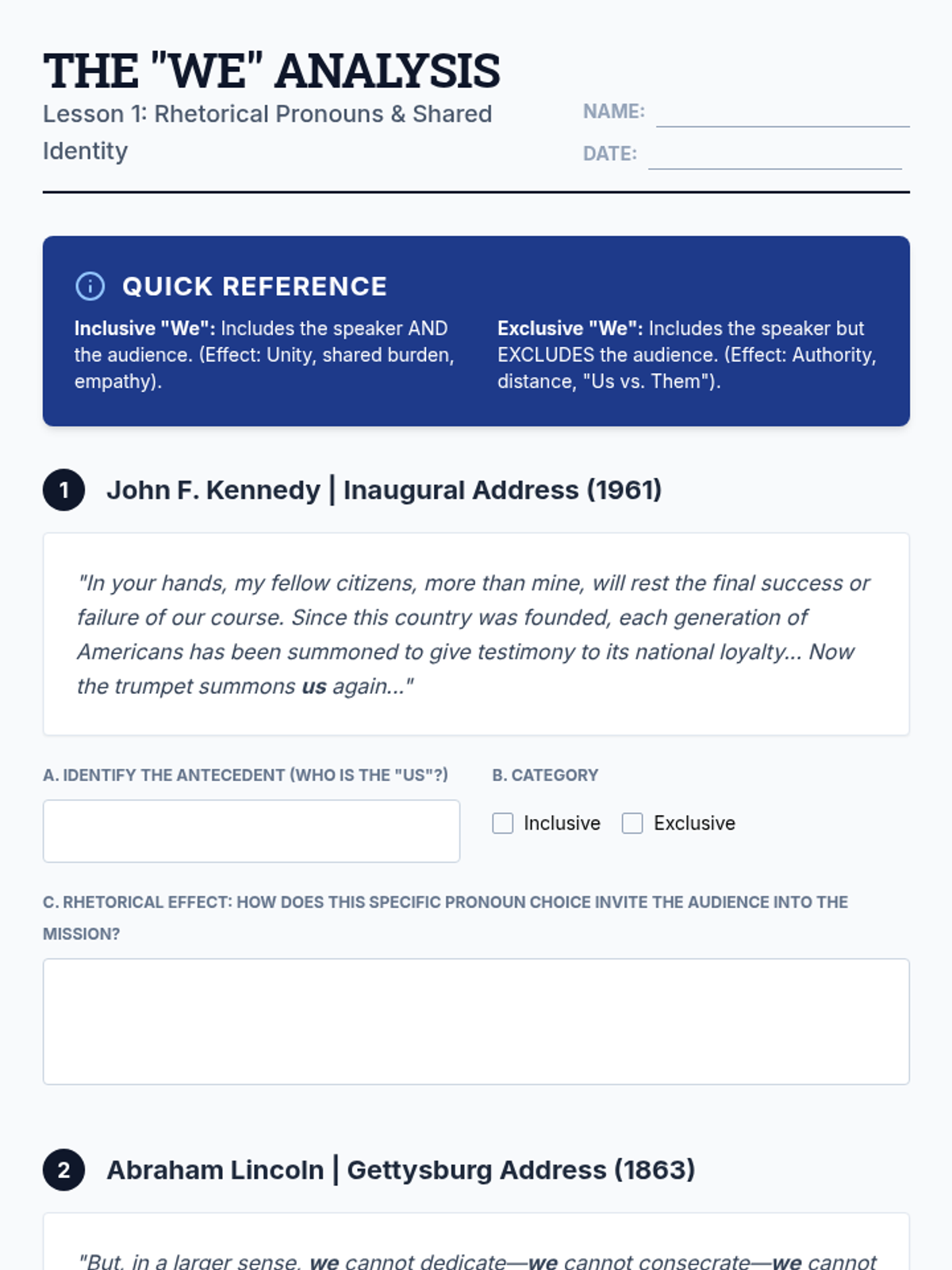 A rhetorical analysis sequence for 9th-grade students exploring how pronoun choice (I, we, you, one) influences the relationship between speaker, audience, and subject in persuasive and narrative texts.