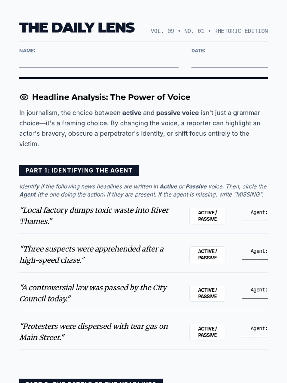 An inquiry-based exploration of active and passive voice through the lens of media literacy, political accountability, and historical agency for 8th-grade students. Students investigate how grammatical choices influence public perception and the ethics of linguistic transparency.