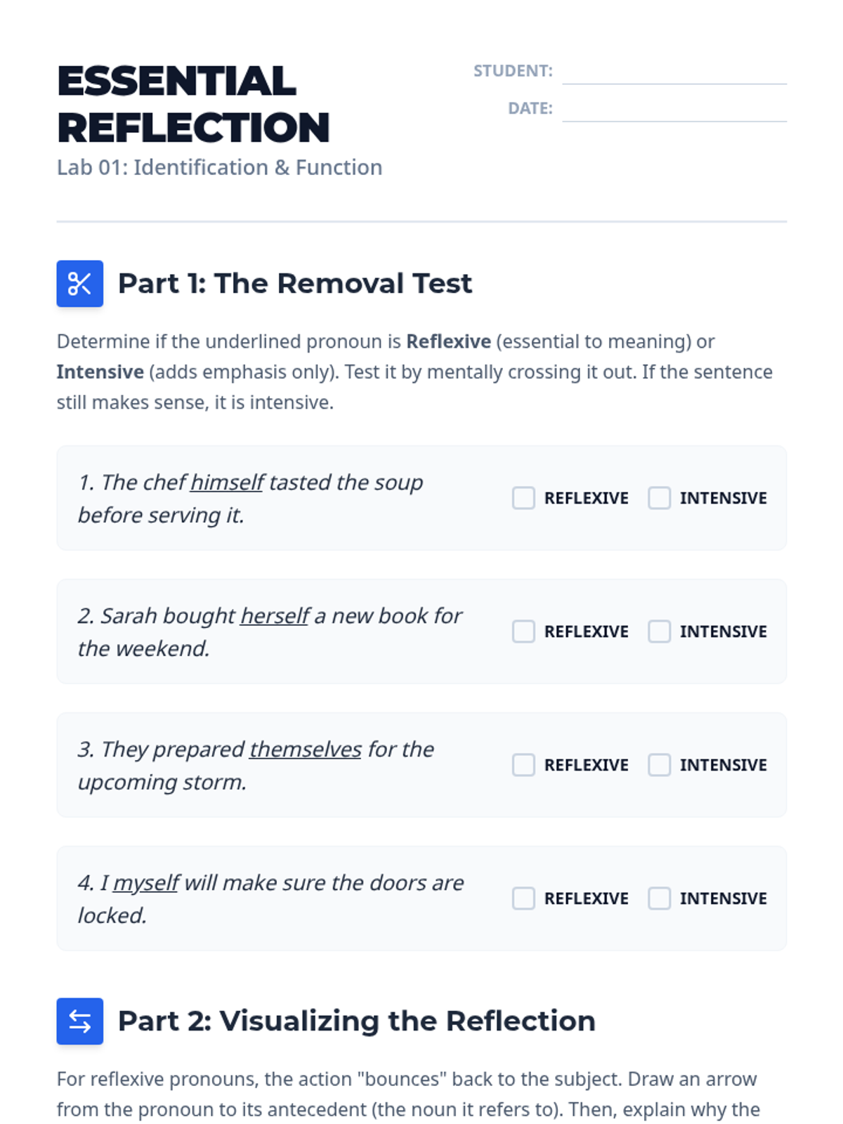 A comprehensive 9th-grade grammar sequence focusing on the proper use of reflexive and intensive pronouns, addressing common hyper-correction errors and rhetorical emphasis.