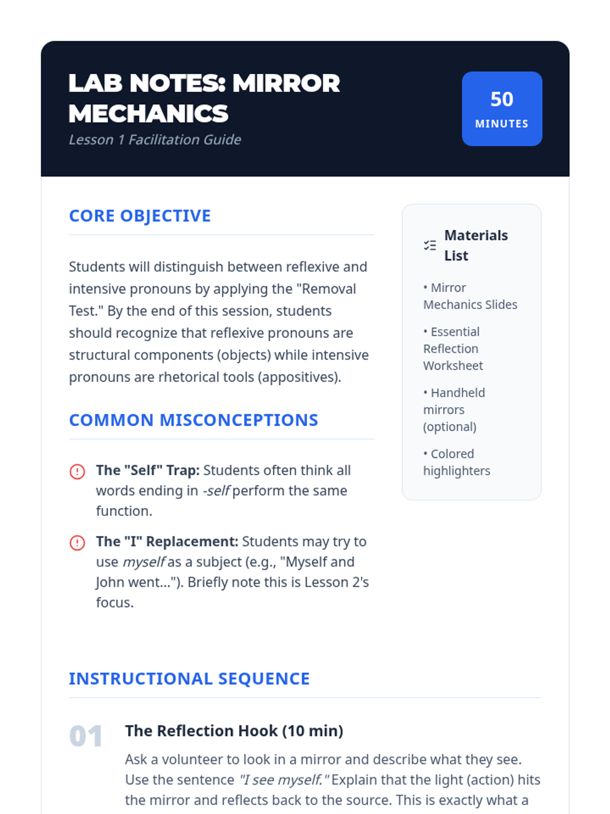 This sequence explores the mechanics of pronoun case in sophisticated 9th-grade writing. Students master nominative, objective, and possessive cases through structural analysis, error debunking, and formal application in complex sentences and comparisons.