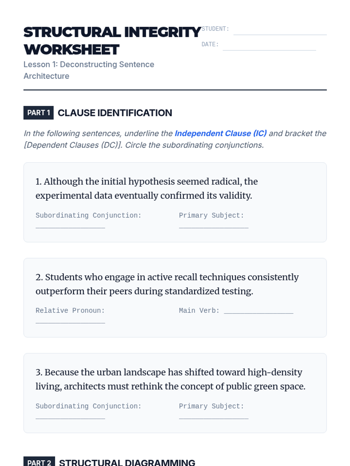 This sequence focuses on Subject-Verb Agreement when prepositional phrases intervene between the subject and the verb. Students learn to identify 'true' subjects, ignore 'interrupters', and maintain grammatical logic in complex sentence structures through a structural engineering-themed workshop approach.