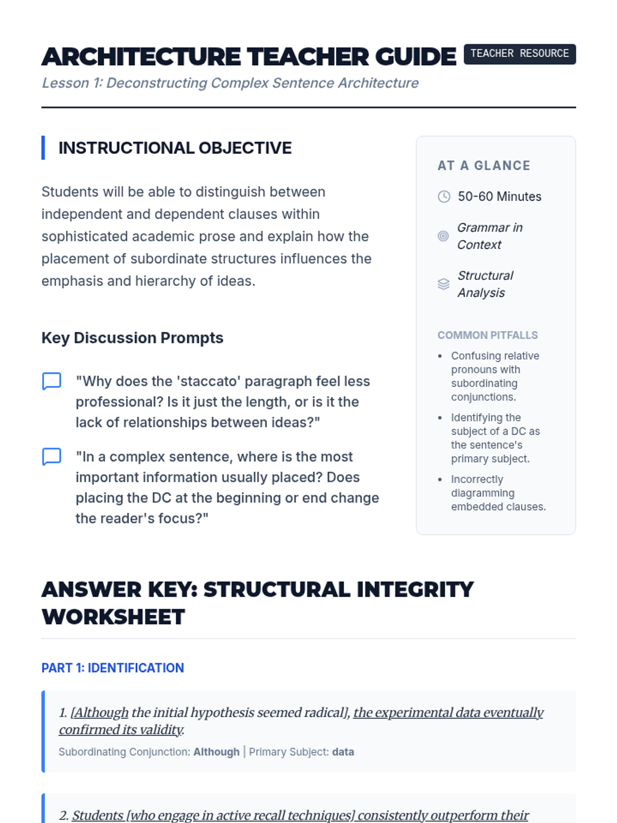 This sequence treats sentence structure as a foundational skill, focusing on the grammatical mechanics of active and passive voice. Students move from deconstructing sentence anatomy to mastering complex syntactic transformations and editing for conciseness.