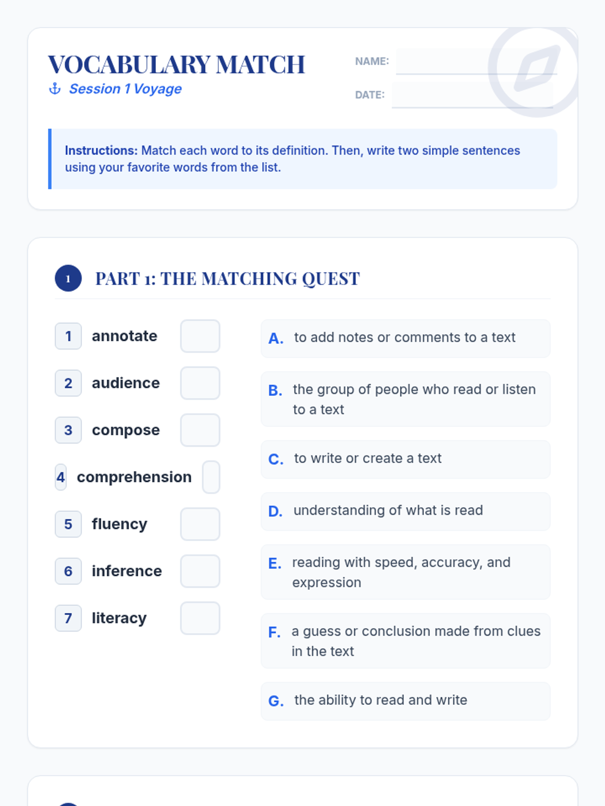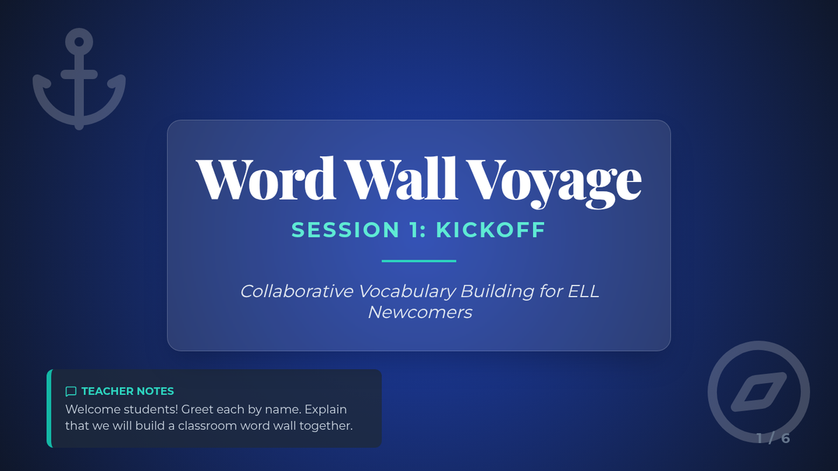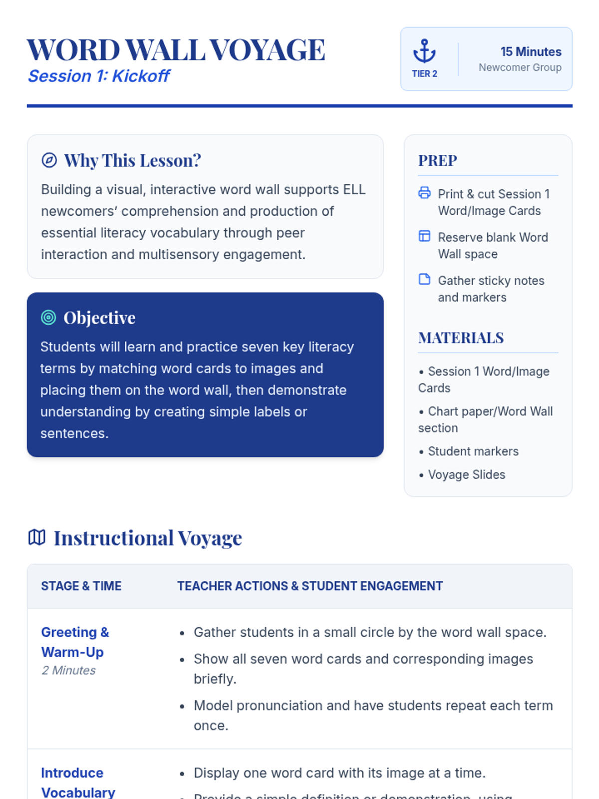 A 5-session vocabulary-building unit for ELL newcomers using a classroom word wall and nautical-themed activities to master key literacy terms.