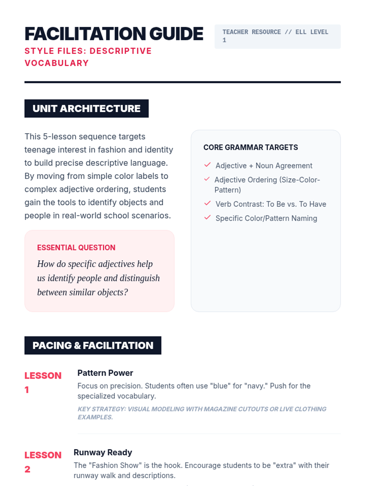 A 5-lesson sequence for 9th-grade Beginner English students focused on visual description, clothing, and personal style. Students progress from basic colors and patterns to expressing personal fashion preferences and creating a comprehensive style profile.