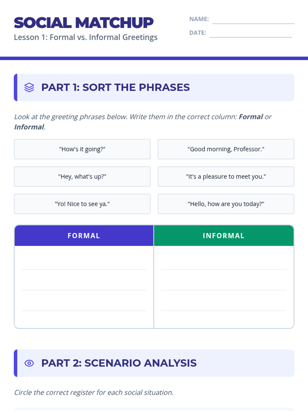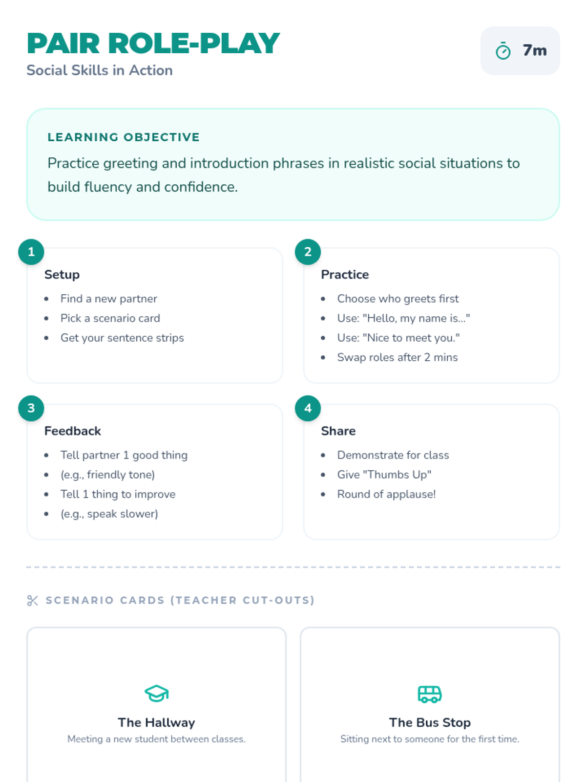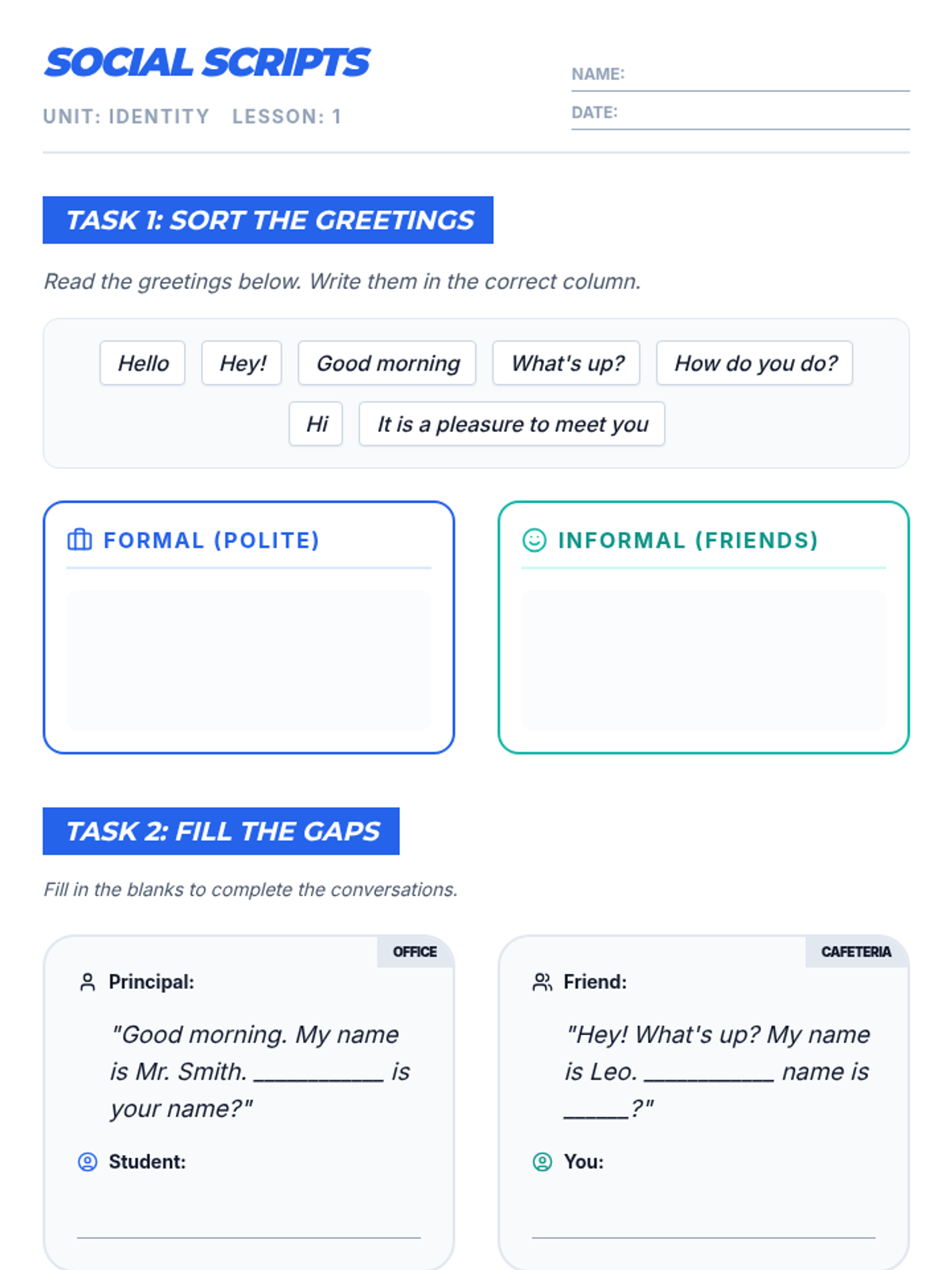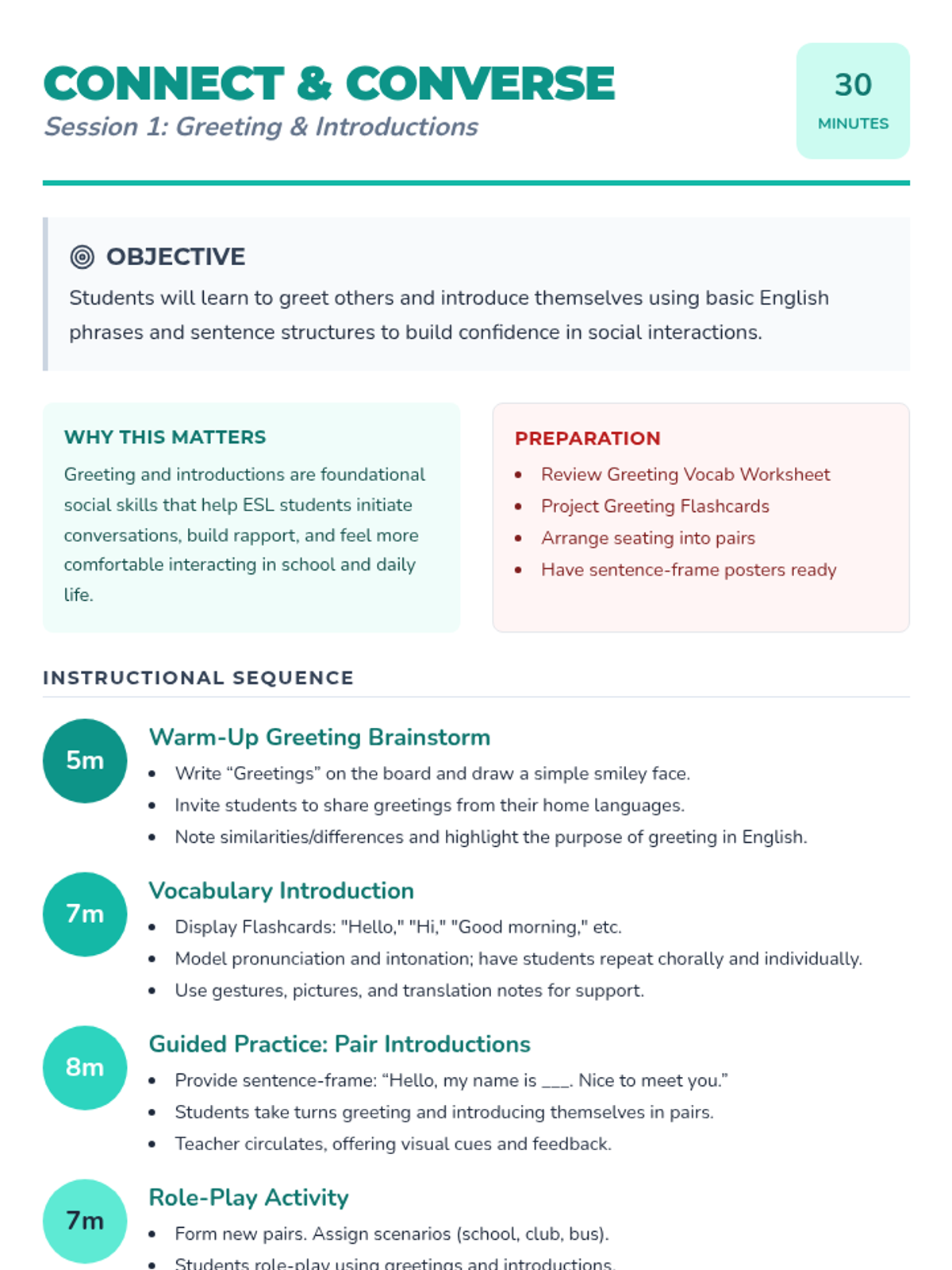 A 4-session social skills unit designed for high school ESL students, focusing on practical communication and interpersonal strategies. Each 30-minute lesson builds vocabulary, confidence, and real-world speaking opportunities to help learners engage socially.