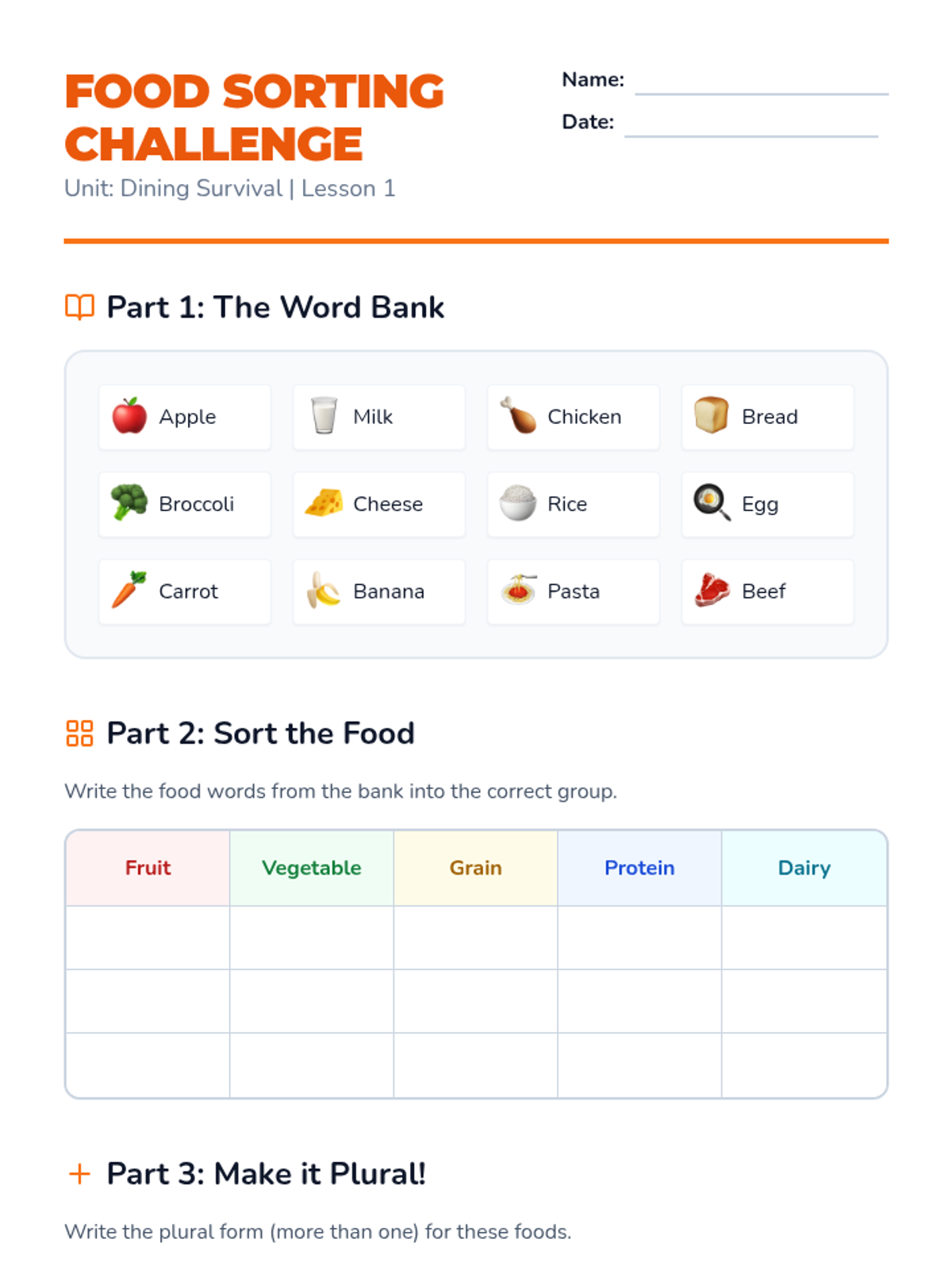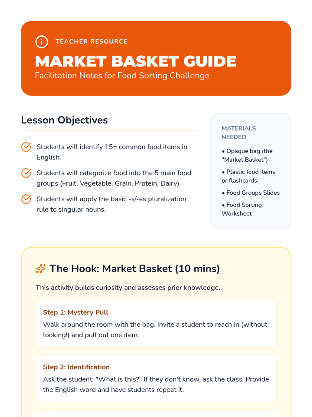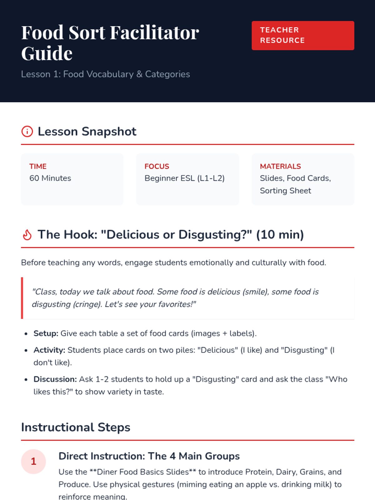 A 5-lesson sequence for beginner ESL students focused on food vocabulary and dining transactions, moving from basic identification to full-scale cafeteria simulations.