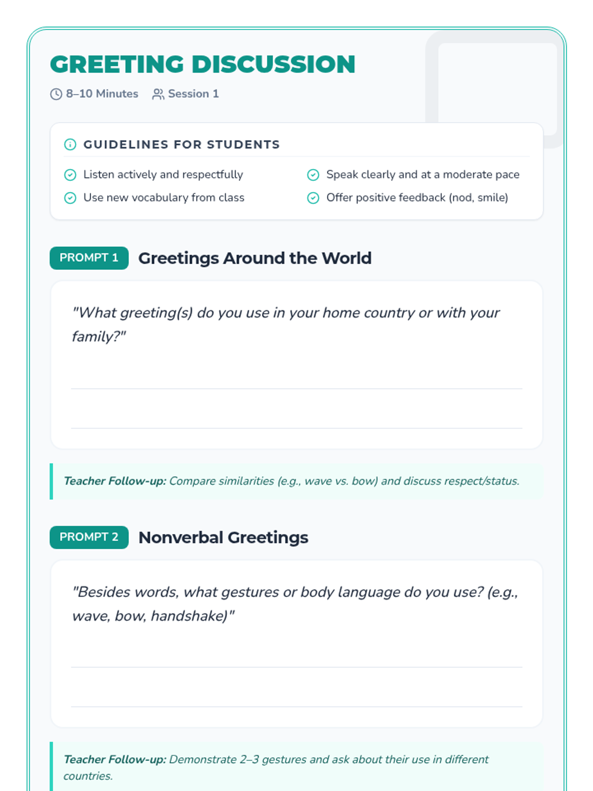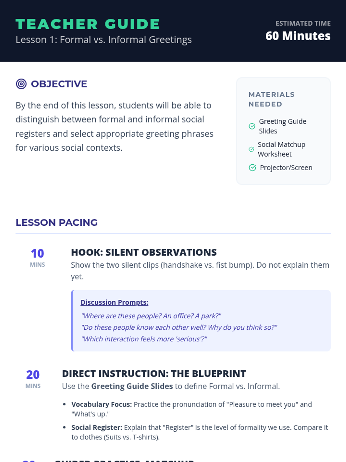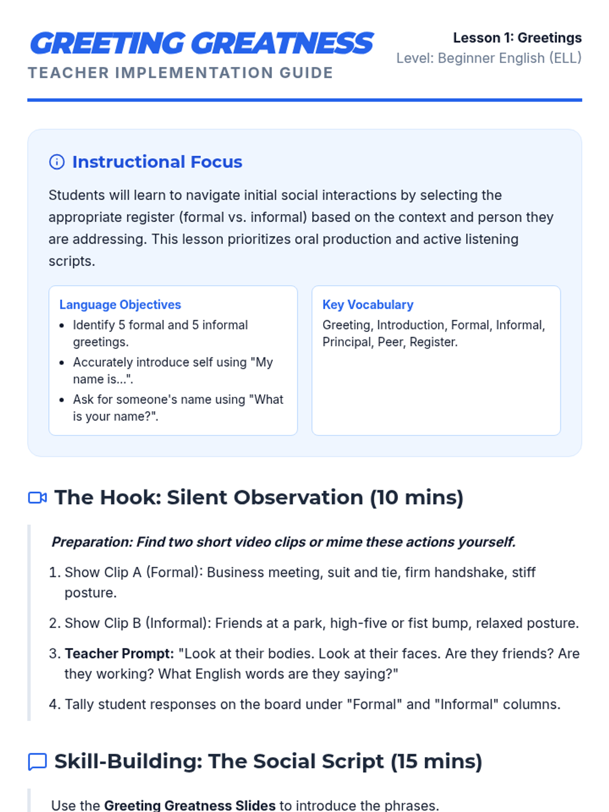 A comprehensive unit for high school English language learners to master the social nuances of greetings, self-introductions, and cultural etiquette in varied contexts.
