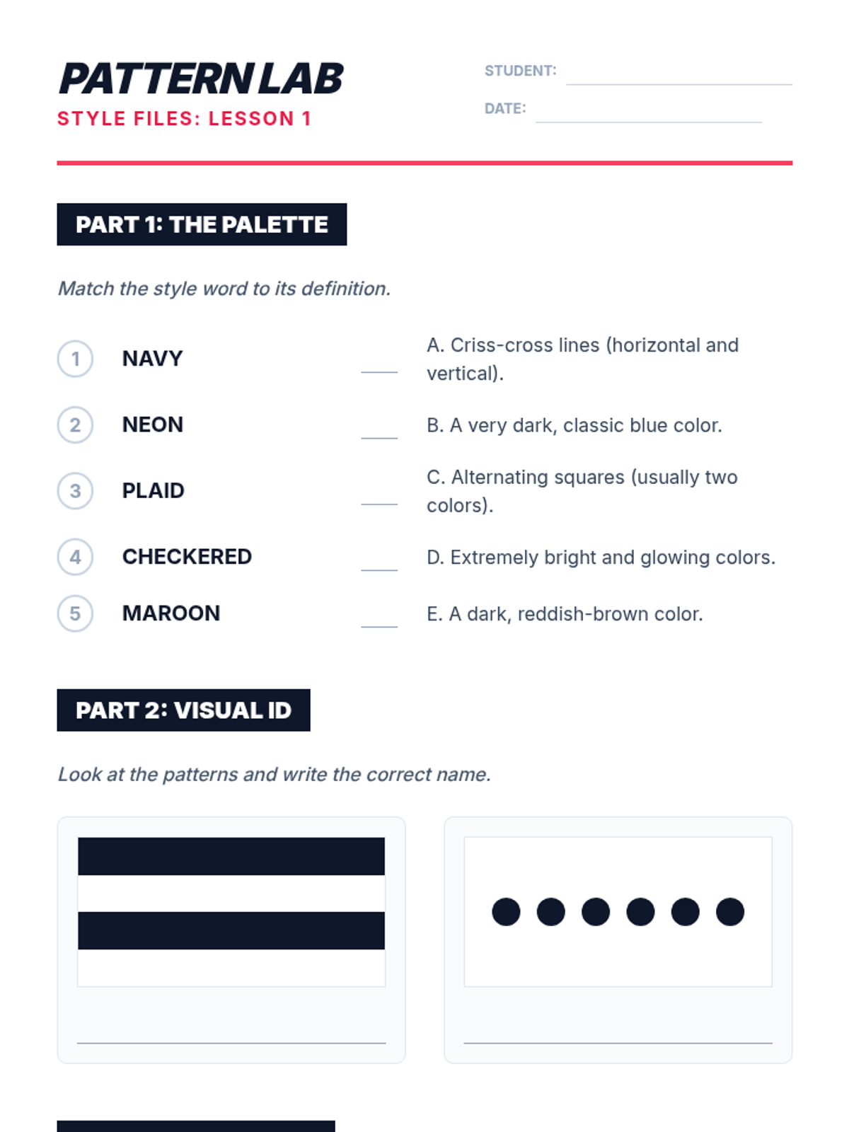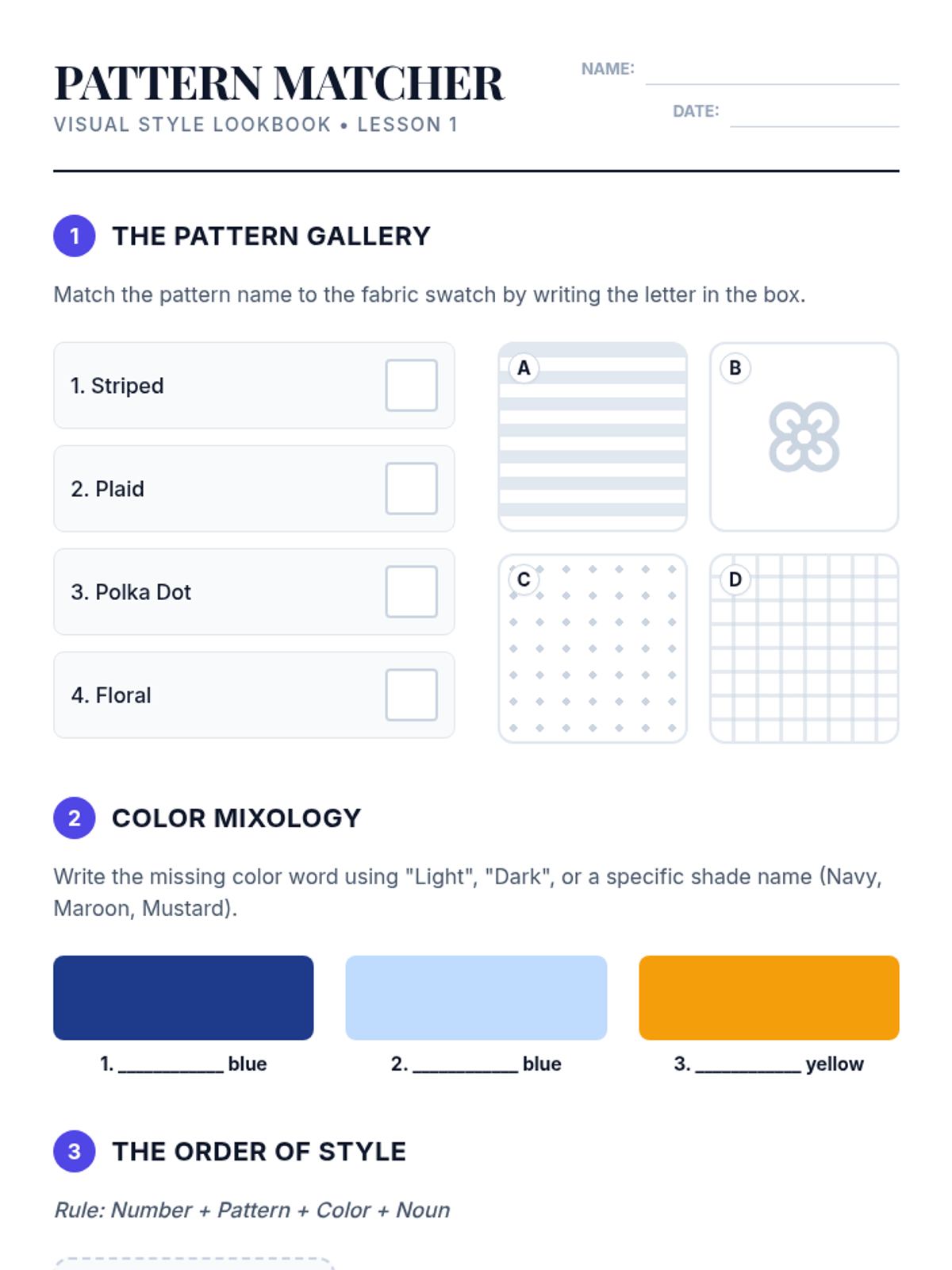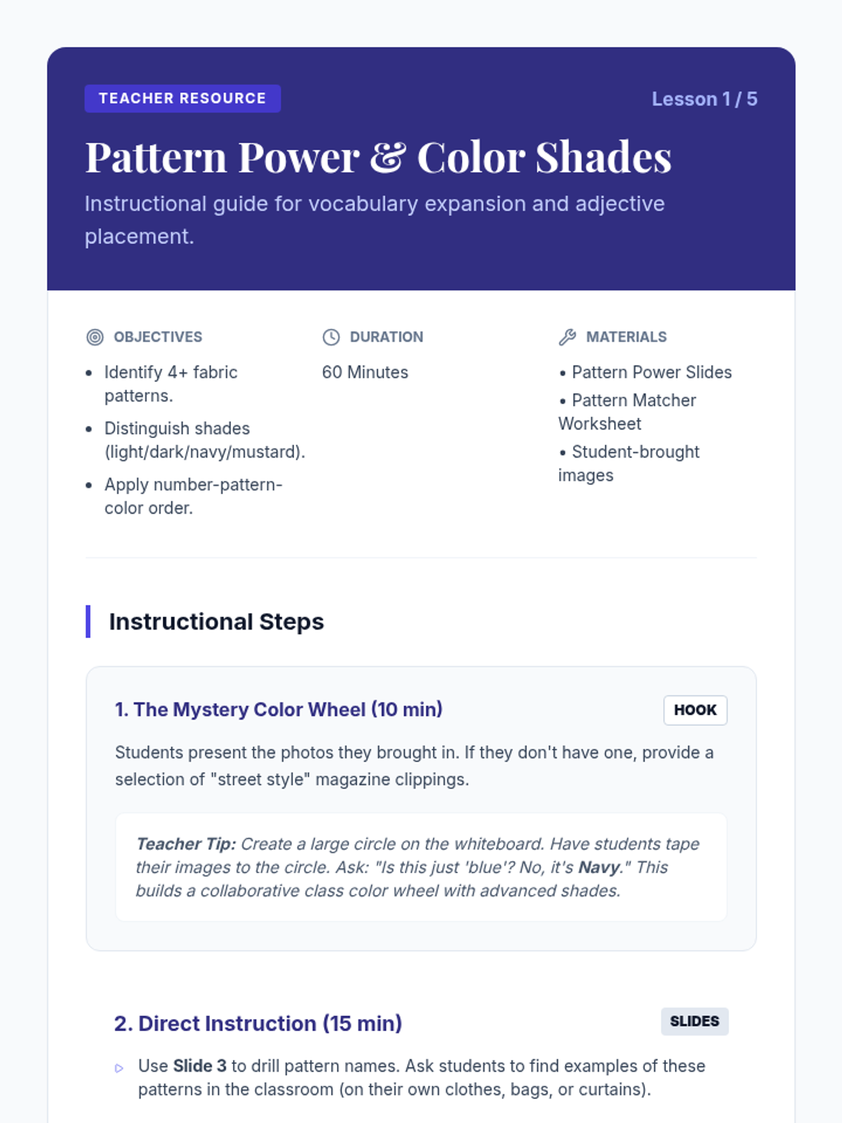 A comprehensive sequence for beginner ELL students focusing on descriptive vocabulary related to fashion, patterns, and physical characteristics. Students progress from basic colors to complex physical descriptions, culminating in a creative character-writing project.