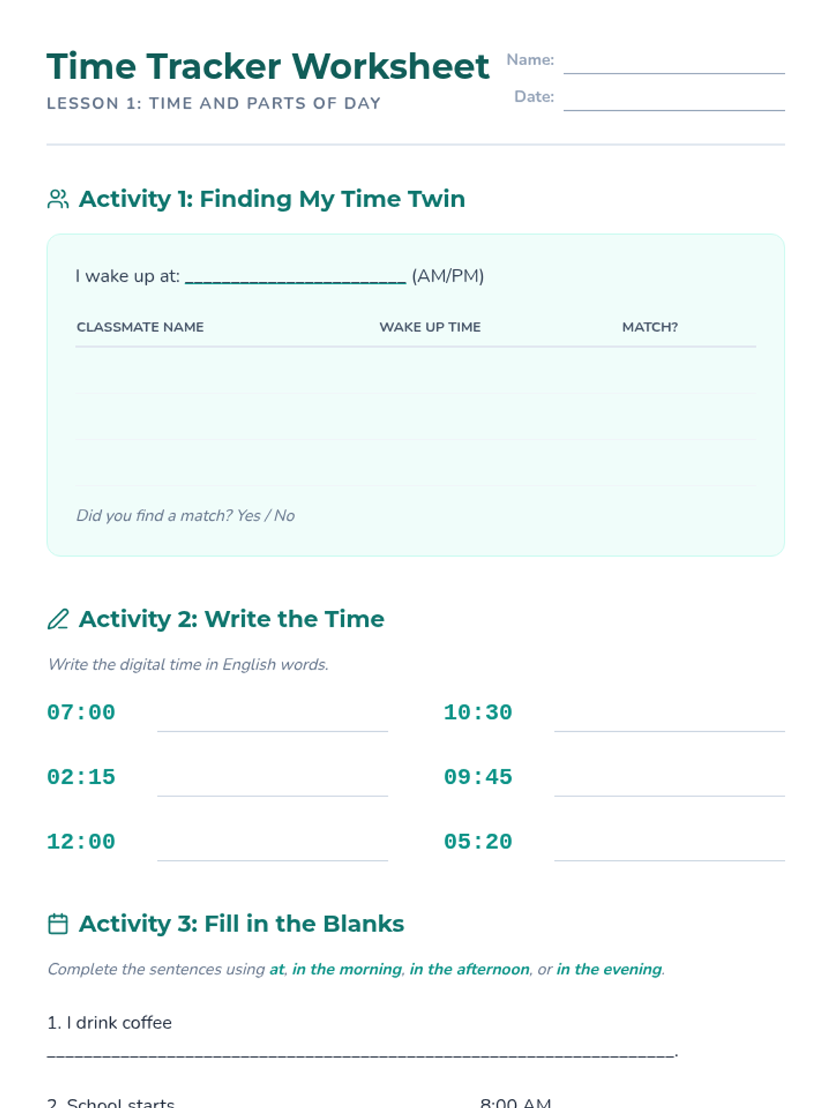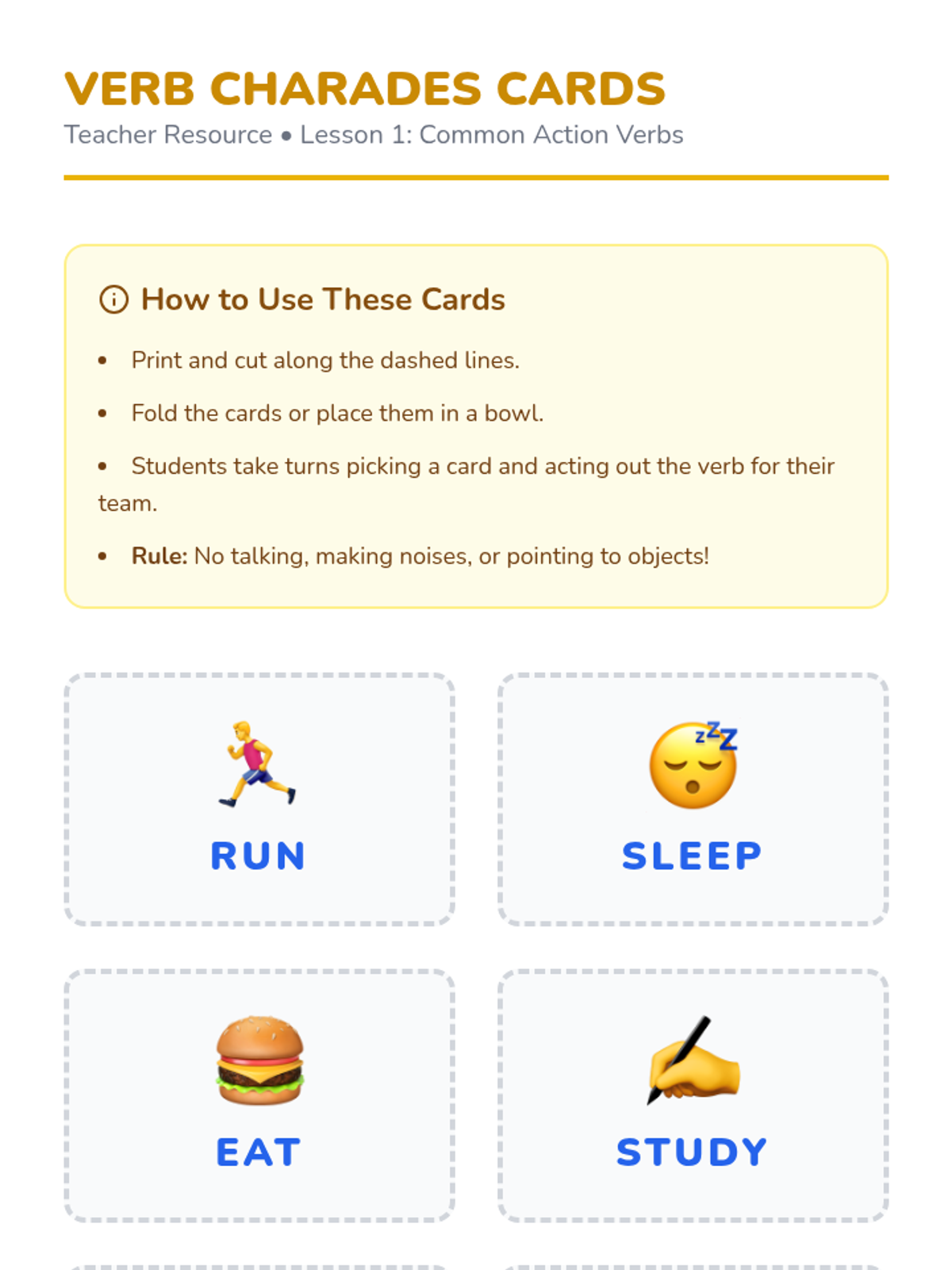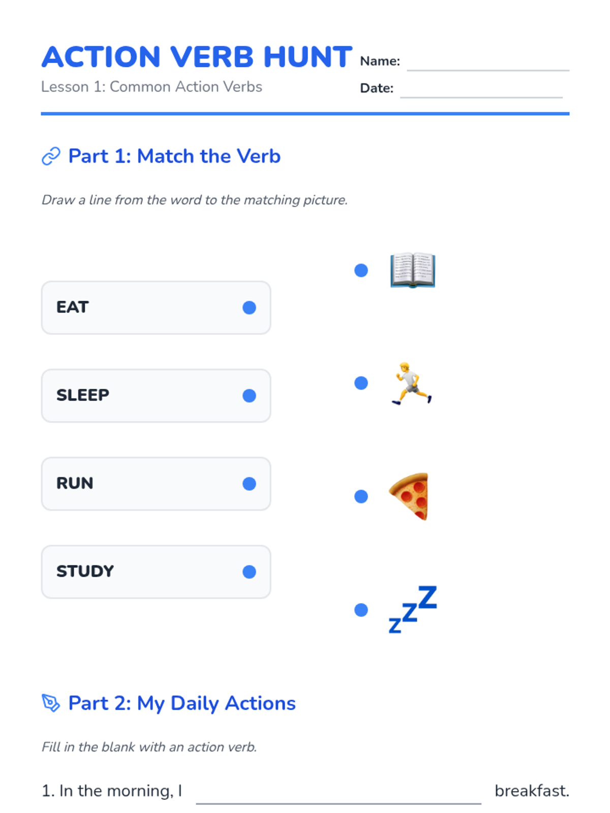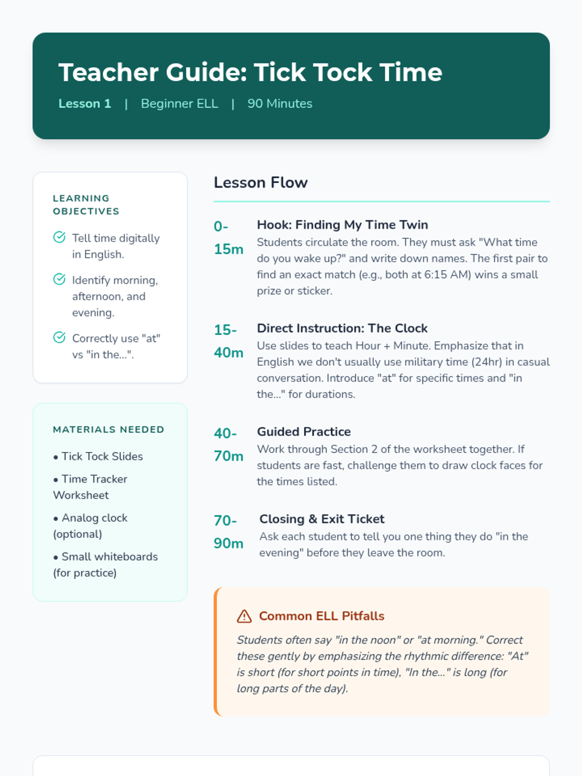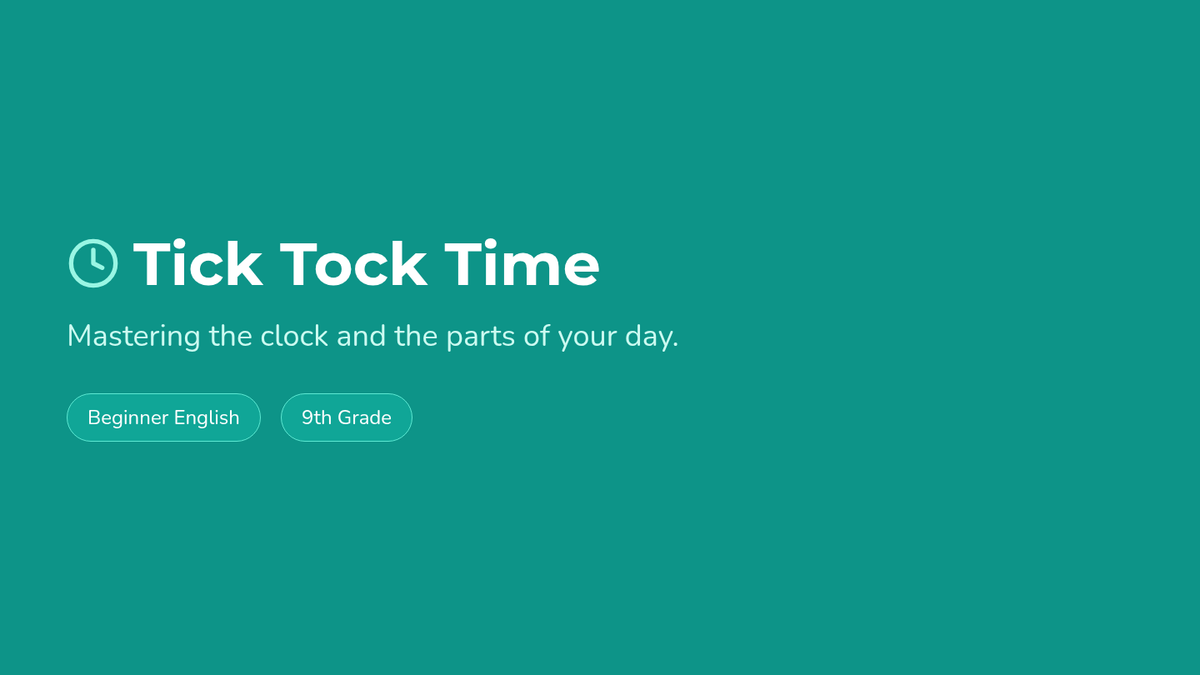 A foundational sequence for 6th-grade ESL beginners focused on high-frequency action verbs, time-telling, and sequencing routines. Students build the vocabulary and structures needed to describe their daily lives and personal preferences.