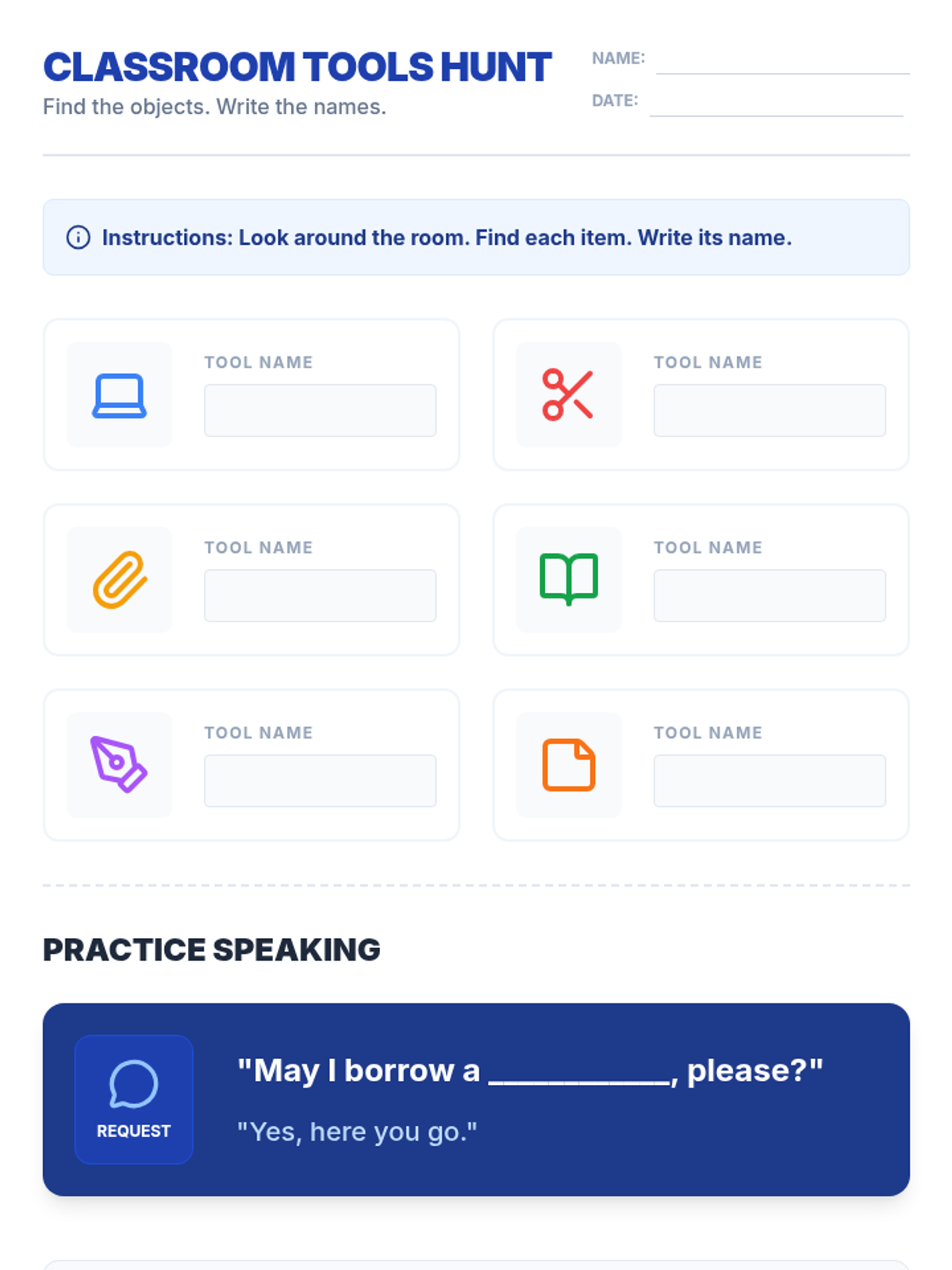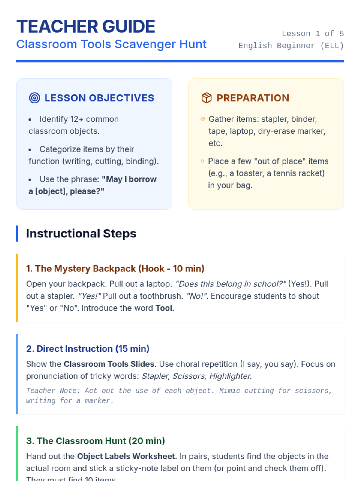A 5-lesson unit for beginner English Language Learners (ELLs) focusing on classroom objects, instructional commands, colors, numbers, and prepositions. The sequence uses Total Physical Response (TPR) and gamified activities to build foundational vocabulary.