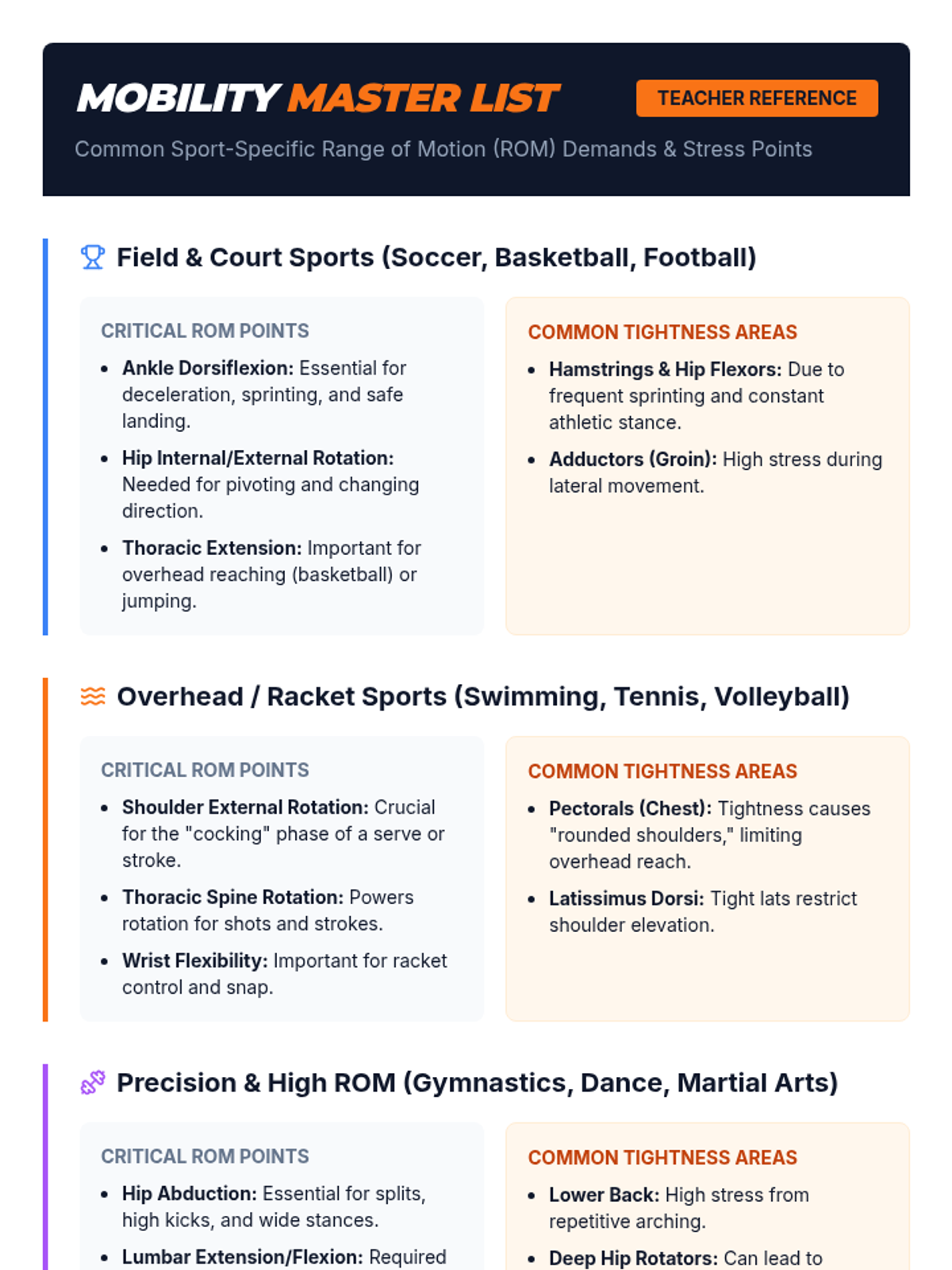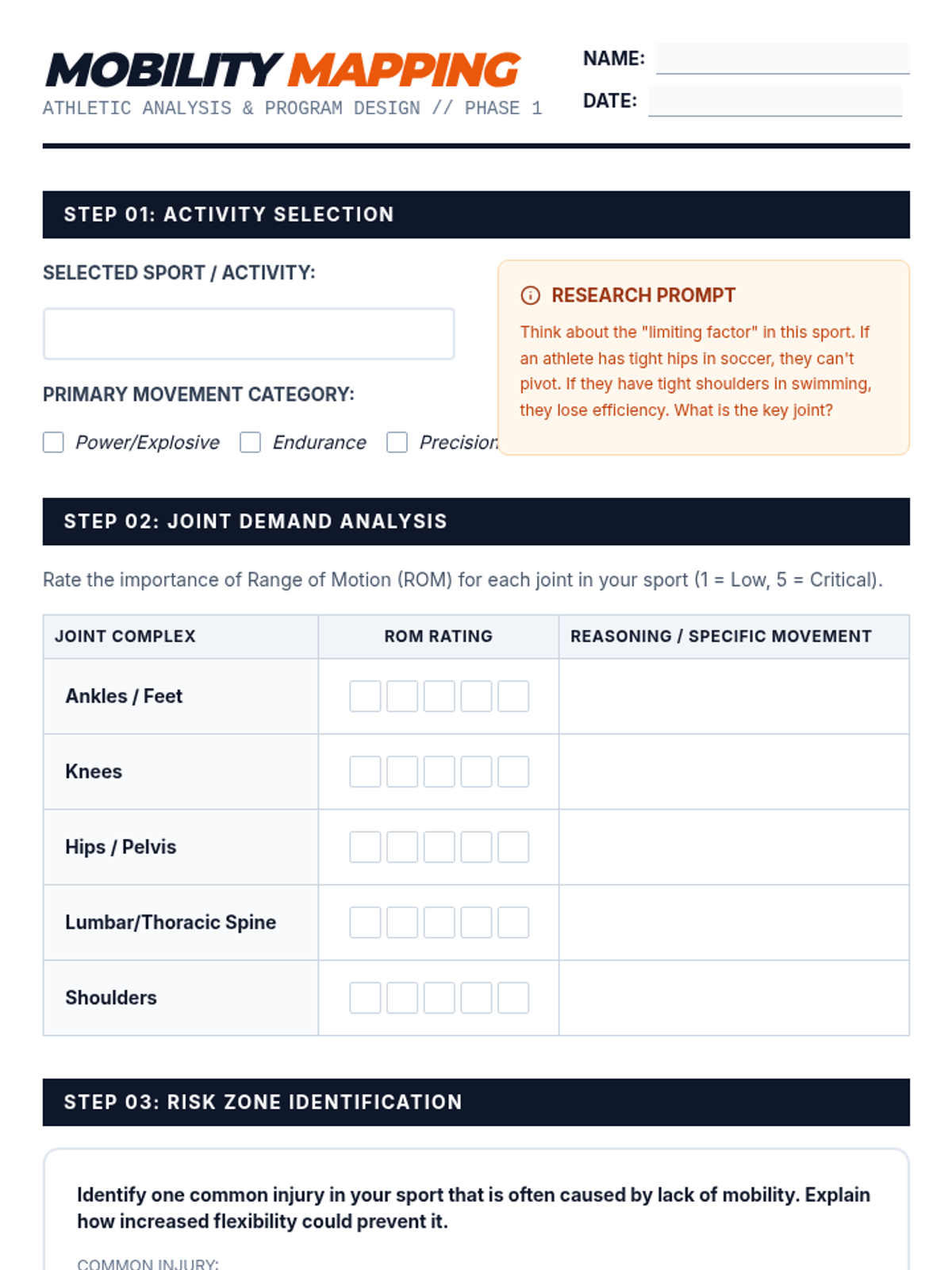A project-based sequence where 8th-grade students act as athletic trainers to design and lead sport-specific flexibility routines, moving from research and personal assessment to instructional leadership.