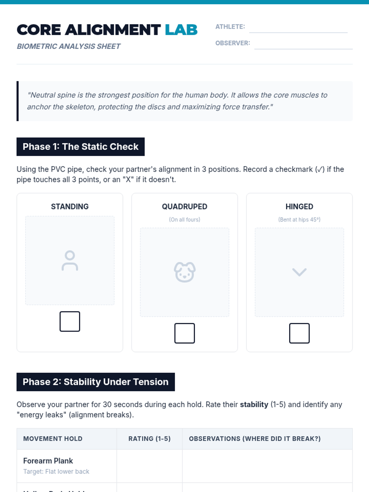 This sequence explores advanced neuromuscular control, focusing on the kinetic chain, core stability, and dynamic balance. Students progress from anatomical understanding to complex functional movement patterns designed to enhance athletic performance and prevent injury.