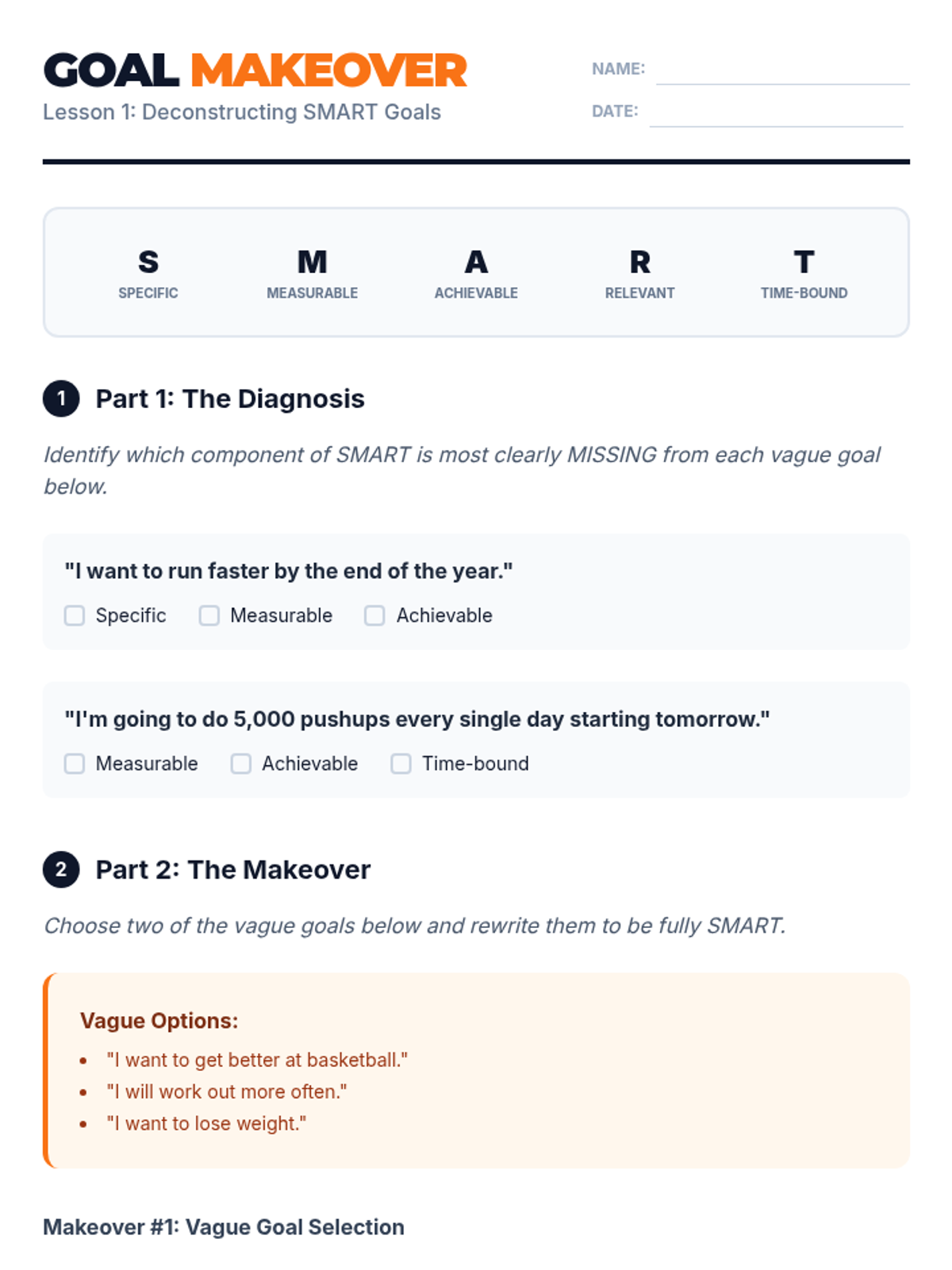 A data-driven workshop sequence where students transition from vague fitness ideas to concrete, actionable plans. They master SMART goals, conduct baseline assessments for cardiovascular and muscular health, analyze their performance data, and apply the FITT principle to design a personalized 4-week fitness action plan.