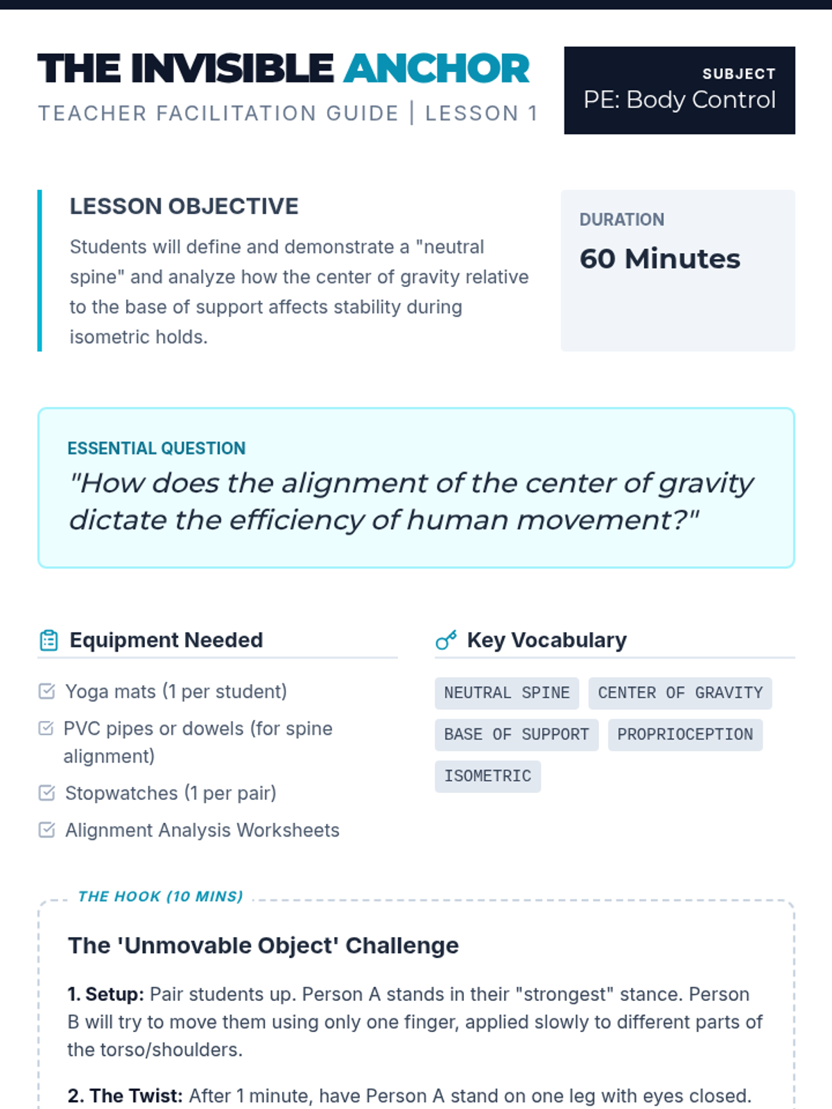 A 5-lesson unit for 9th-grade PE students exploring biomechanics, core stability, and dynamic balance through practical workshops, skill-building drills, and a culminating movement flow project.