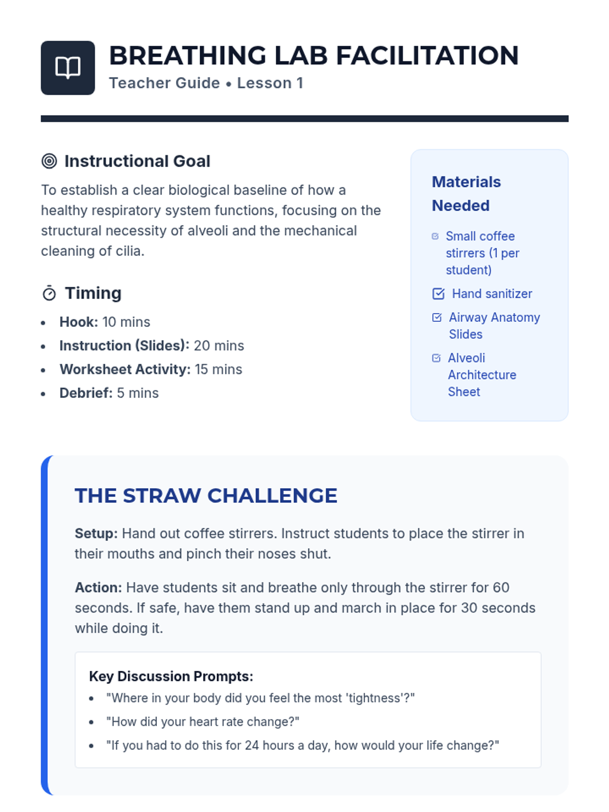 A 9th-grade health sequence focused on respiratory anatomy and the physiological impact of tobacco and nicotine. Students progress from learning healthy lung function to analyzing chemical damage, mechanical failure, and the body's recovery process.
