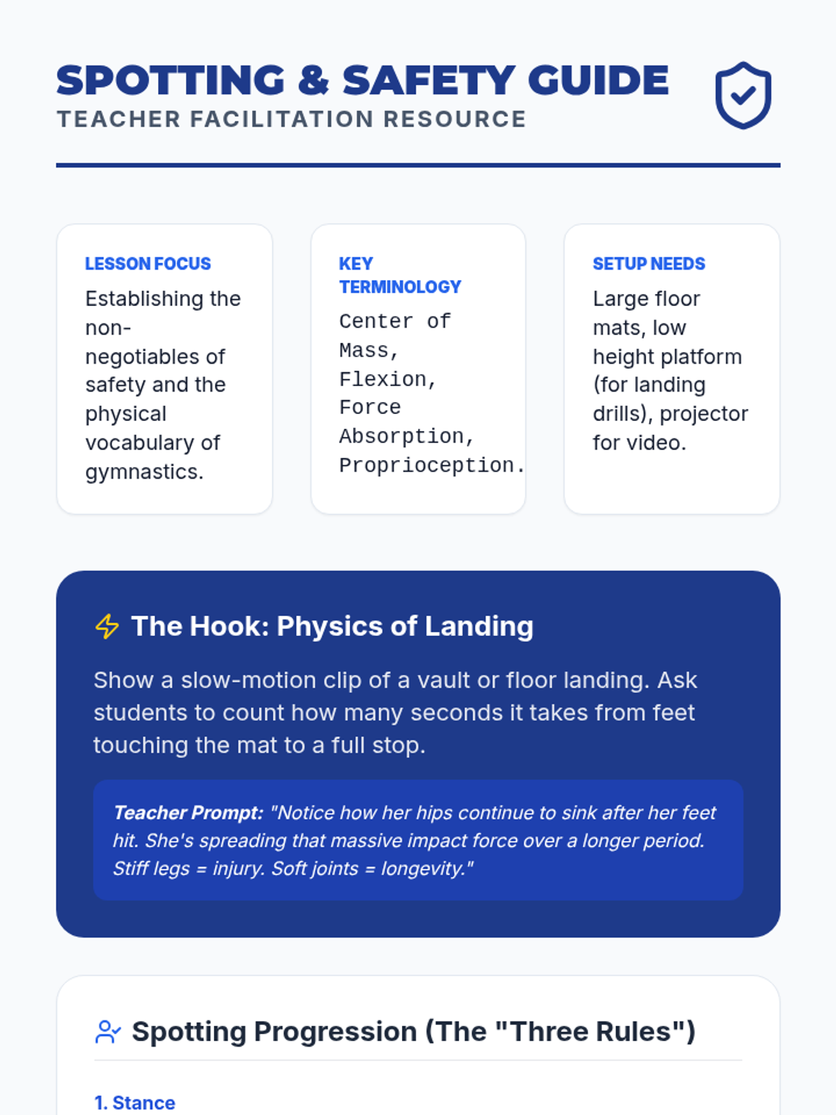 This sequence focuses on the biomechanics and safety of gymnastics apparatus work, specifically the balance beam and vault. Students progress from foundational balance skills to complex vaulting mechanics, emphasizing center of gravity, explosive power, and peer spotting.
