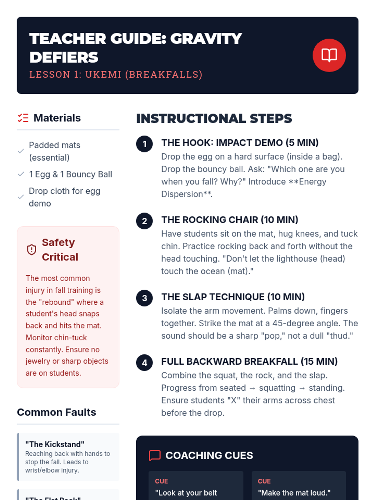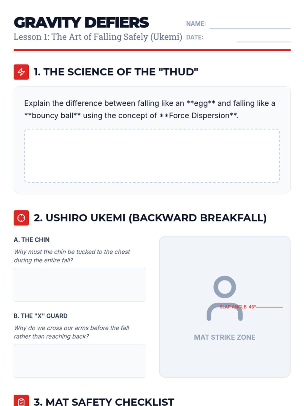 A foundational unit for 7th-grade students focusing on the physical prerequisites of martial arts and self-defense: balance, stability, safe movement, and injury prevention through breakfalls. Students explore how controlling their center of gravity and core can enhance their physical safety and stability.