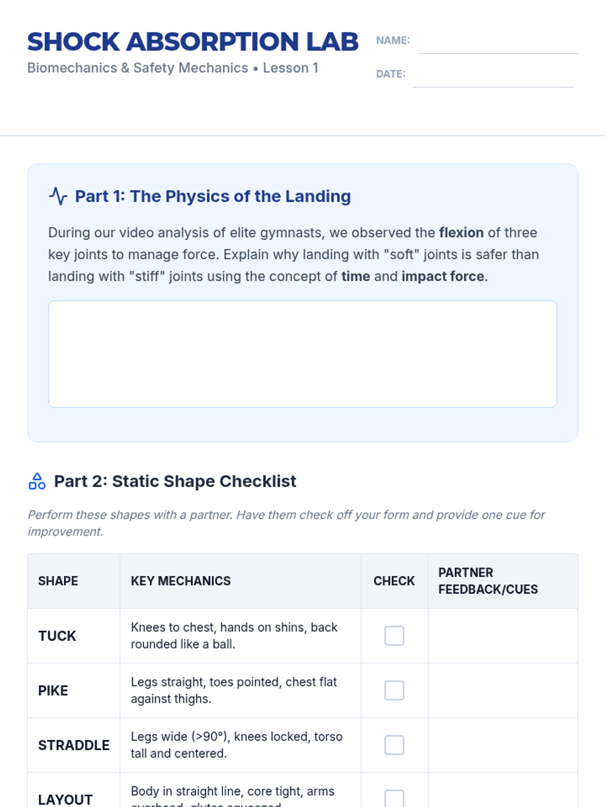 This sequence integrates gymnastics execution with biomechanical principles. Students explore center of mass, stability, leverage, and angular momentum through various tumbling skills, concluding with a video analysis project to critique their own form.