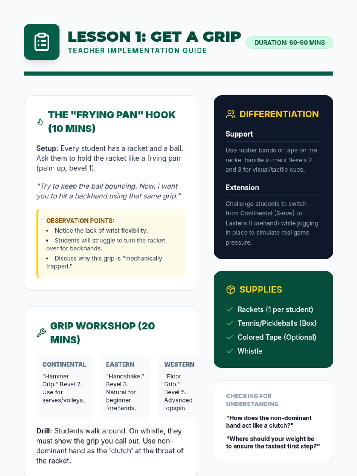 A comprehensive unit for 9th-grade physical education focusing on the biomechanics, technical execution, and footwork required for racket sports like tennis, badminton, and pickleball. Students progress from basic grips to advanced net play, emphasizing the kinetic chain and efficient court movement.