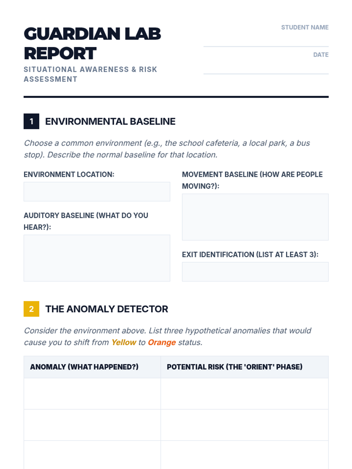 This 9th-grade physical education sequence shifts the focus of self-defense from physical combat to mental preparedness. Students master situational awareness via the OODA Loop, practice verbal de-escalation ('Verbal Judo'), learn the physics of reactionary gaps, and develop basic leverage-based escapes, culminating in pressure-tested scenario simulations.
