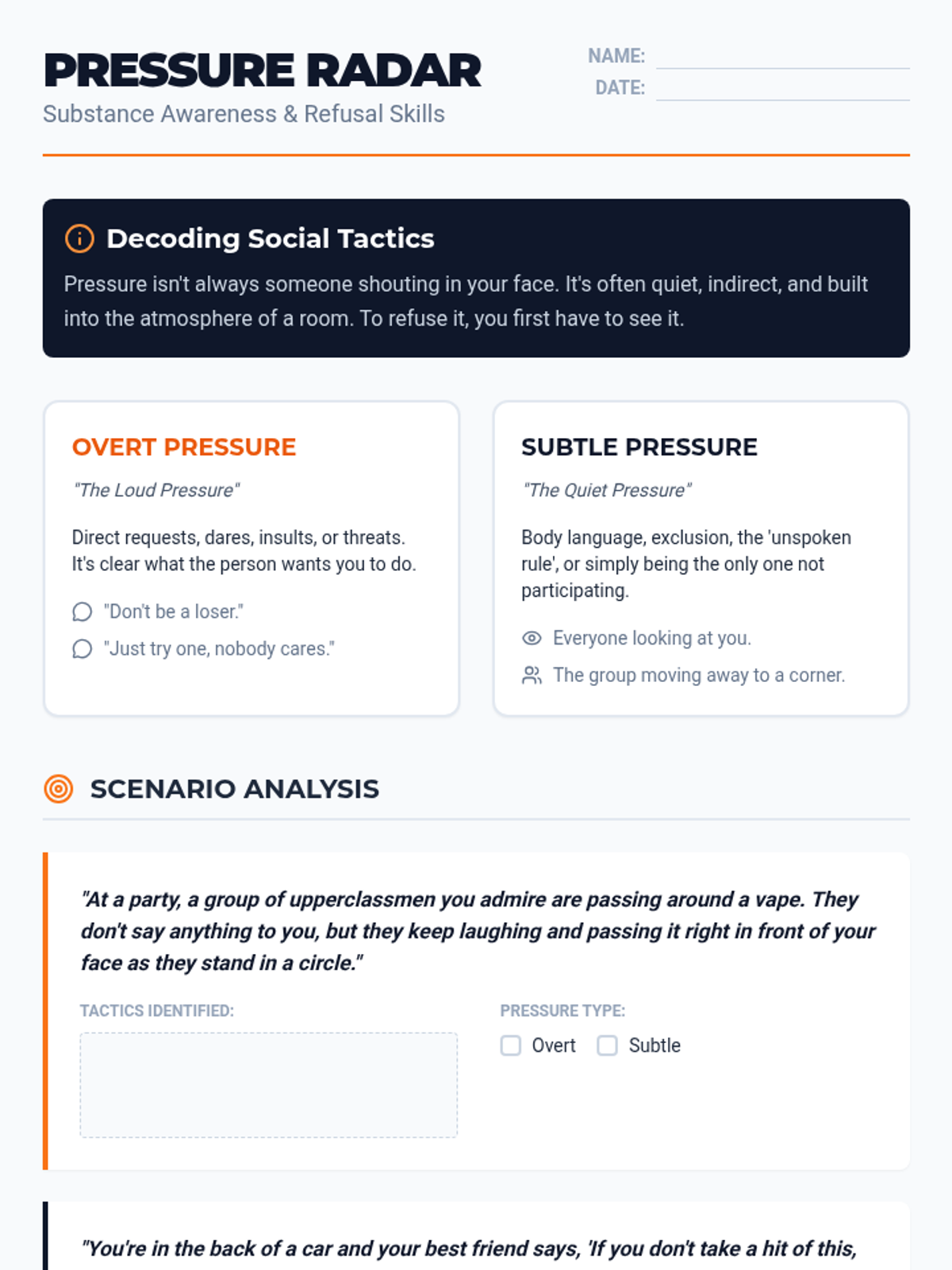 Refusing Peer PressureIdentifies common peer pressure tactics and builds assertive communication skills to set healthy boundaries. Equips students with specific refusal strategies for social situations and high-risk scenarios.