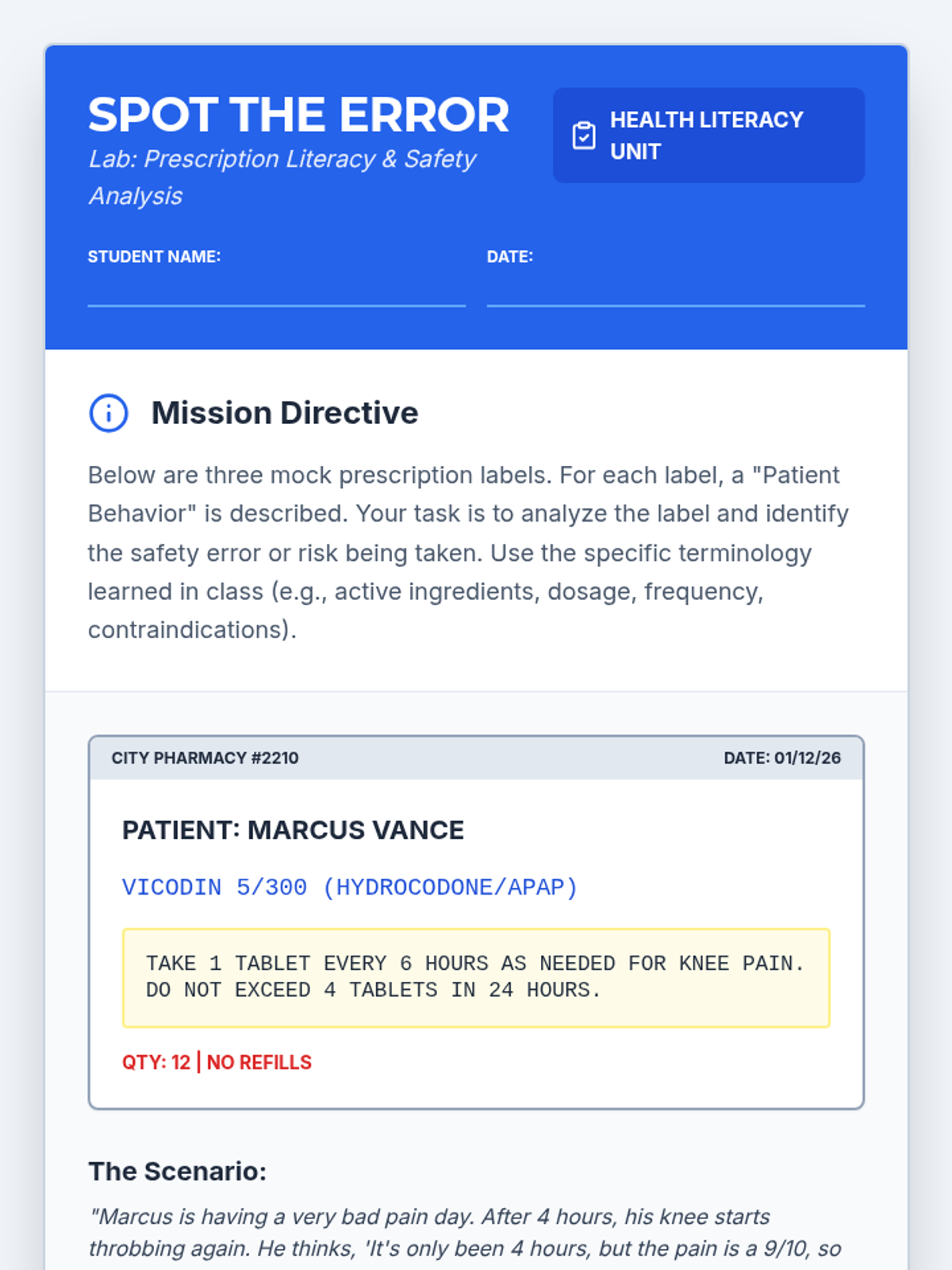 A 5-lesson sequence for 9th-grade students focused on opioid awareness, moving from reading prescription labels to safe storage and refusal skills. Students analyze the transition from medical use to dependency and develop practical safety protocols for medication management.