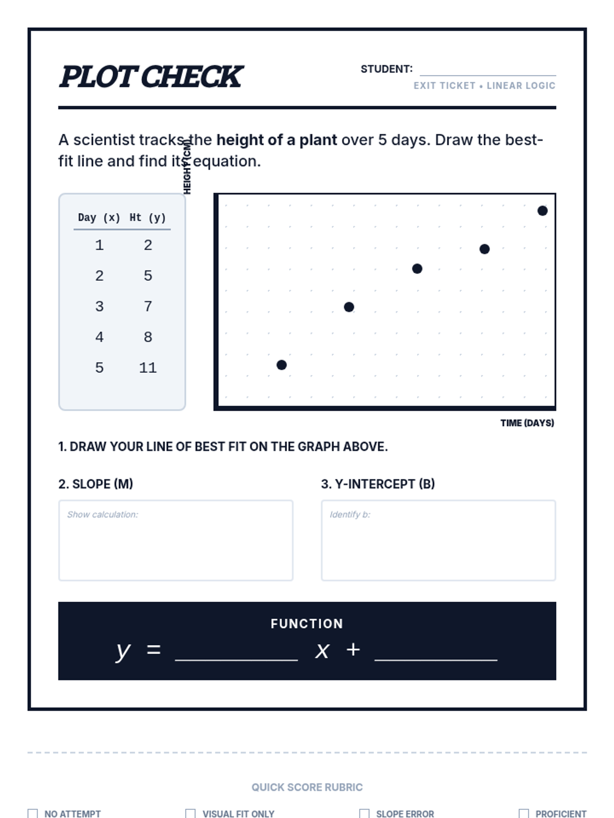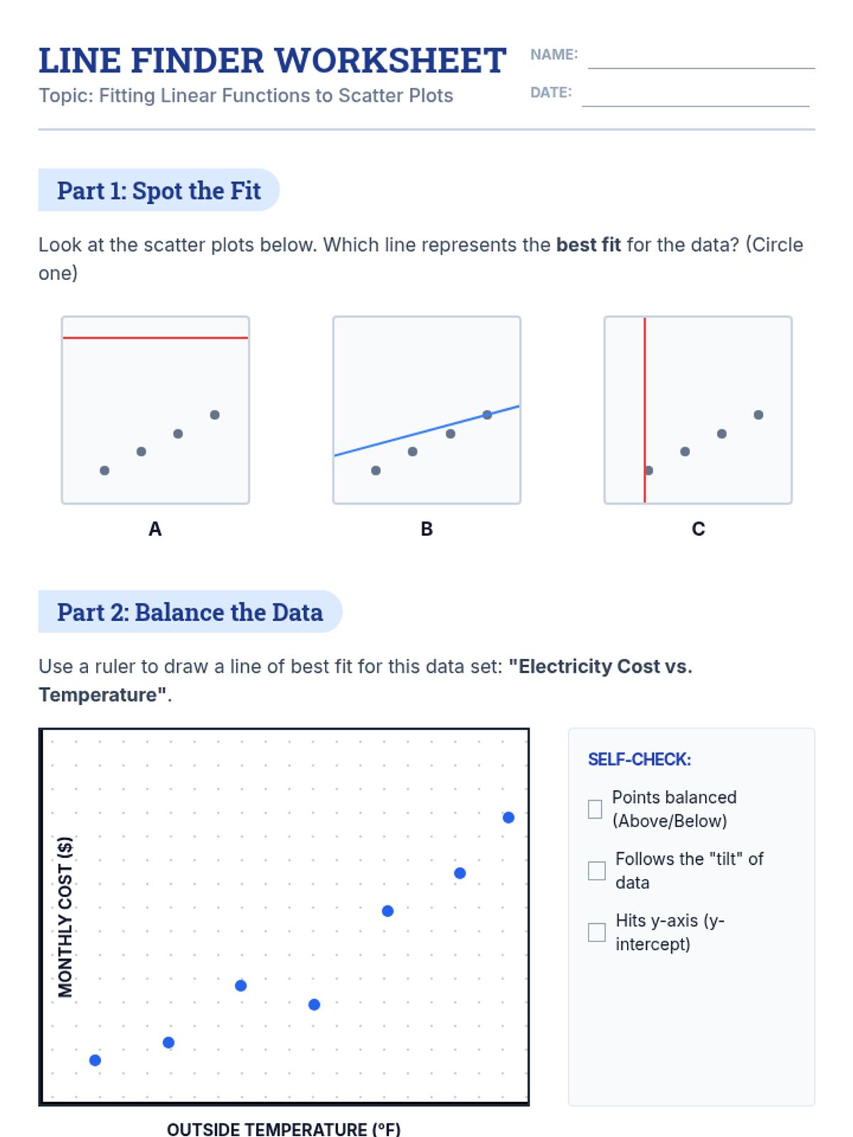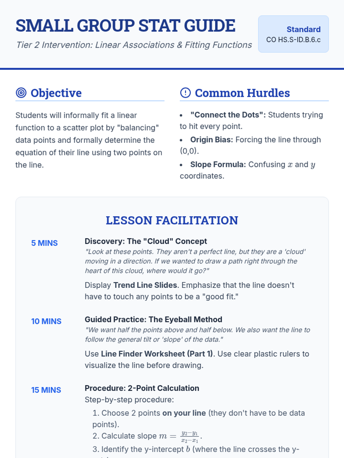 A targeted intervention sequence for high school statistics students focusing on fitting linear functions to scatter plots. It moves from conceptual understanding of 'balance' in data to the procedural steps of calculating lines of best fit.
