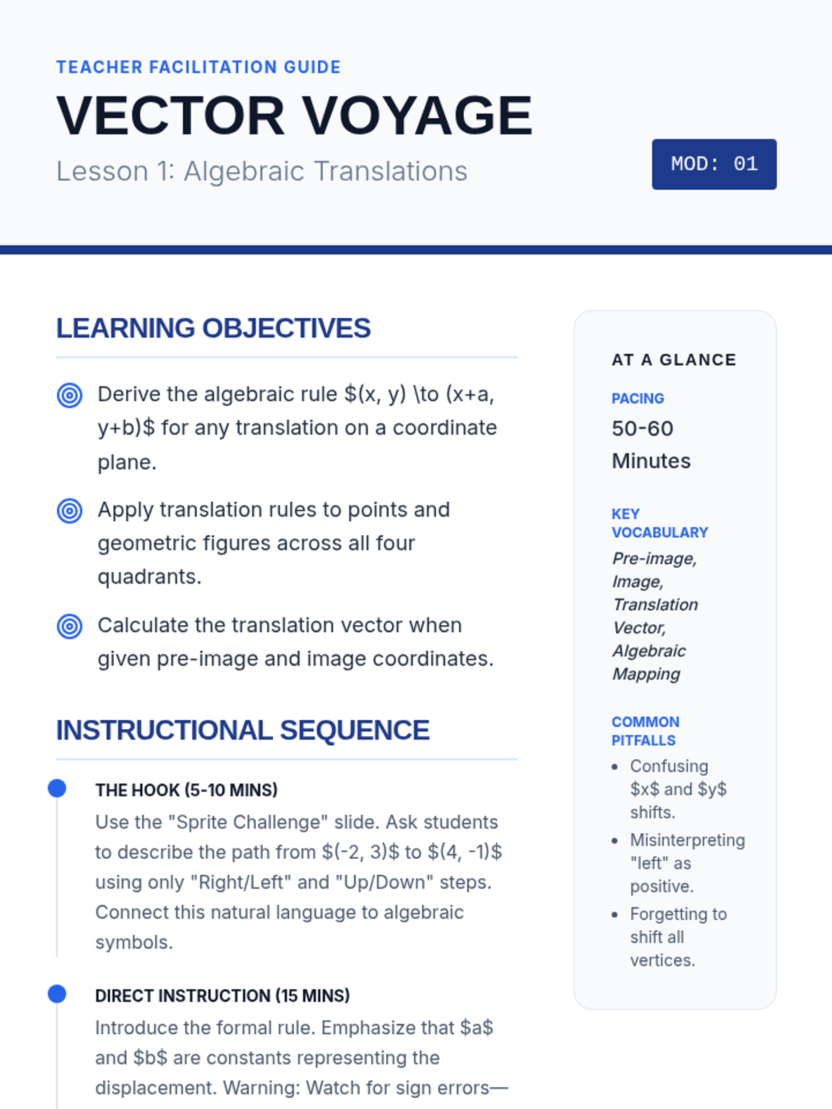 A comprehensive unit on using algebraic rules to represent rigid motions (translations, reflections, and rotations) on the coordinate plane. Students progress from basic rules to complex compositions and congruence verification.