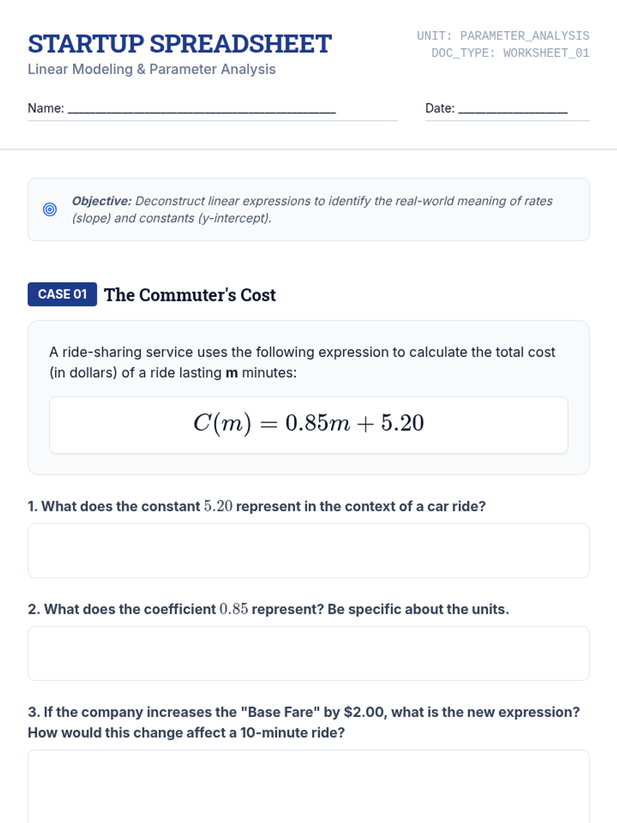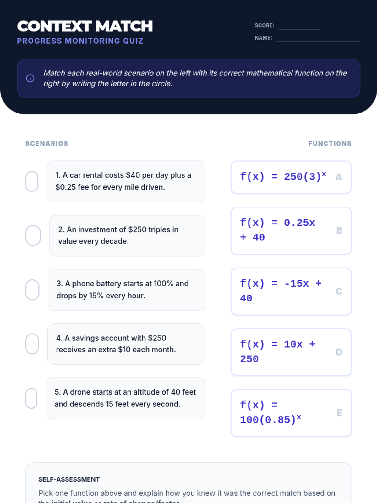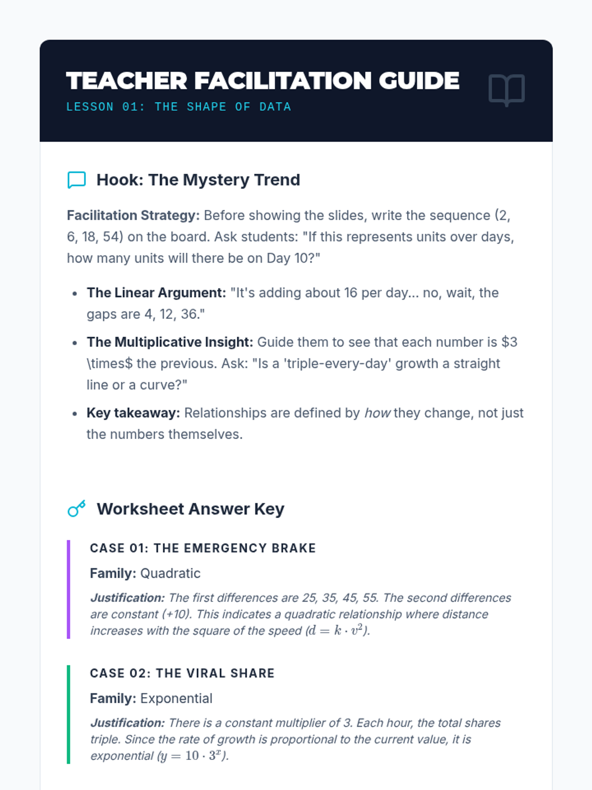 This workshop-style sequence focuses on the technical skills required to construct and compare function representations explicitly. Students move from conceptual understanding to algebraic rigor, learning to write equations for different growth models and comparing their rates of change directly.
