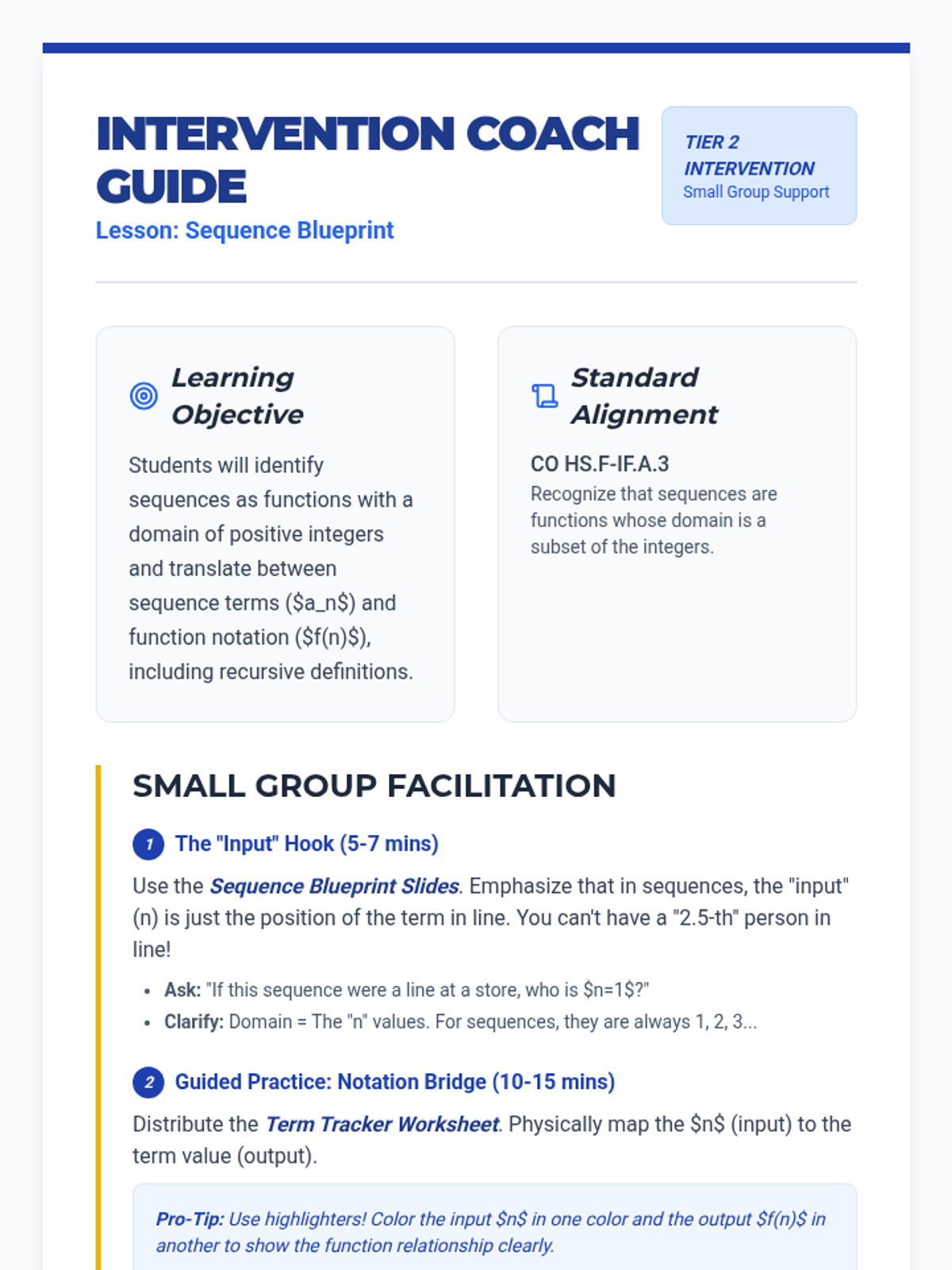A targeted intervention sequence designed to help students bridge the gap between sequences and function notation, focusing on domain and recursive definitions.