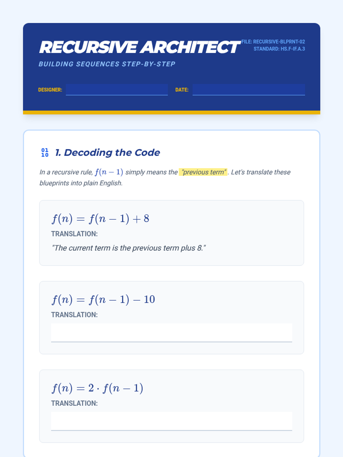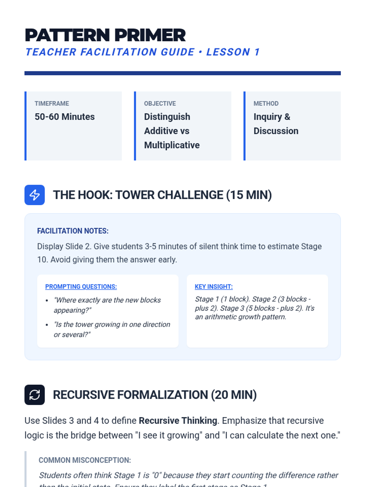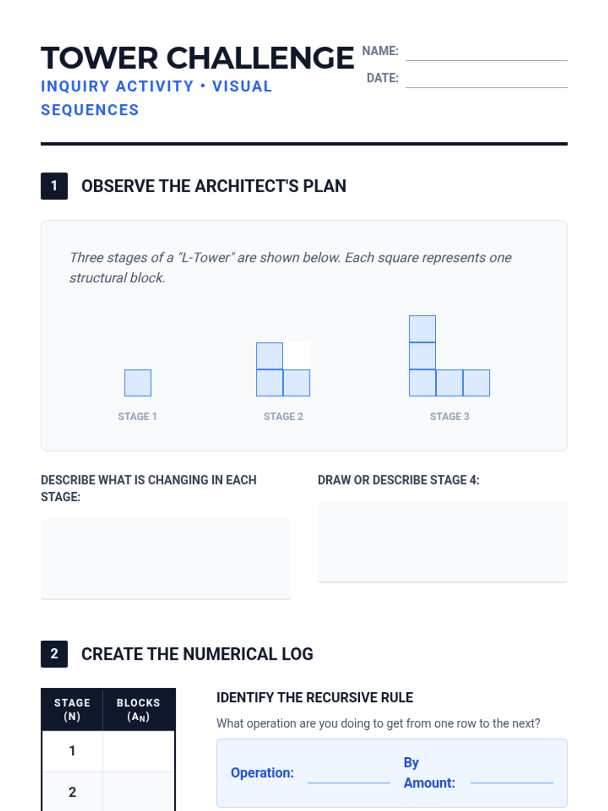 Students move from concrete visual patterns to abstract formulas, exploring arithmetic and geometric growth. They learn to translate sequences into recursive and explicit function rules.