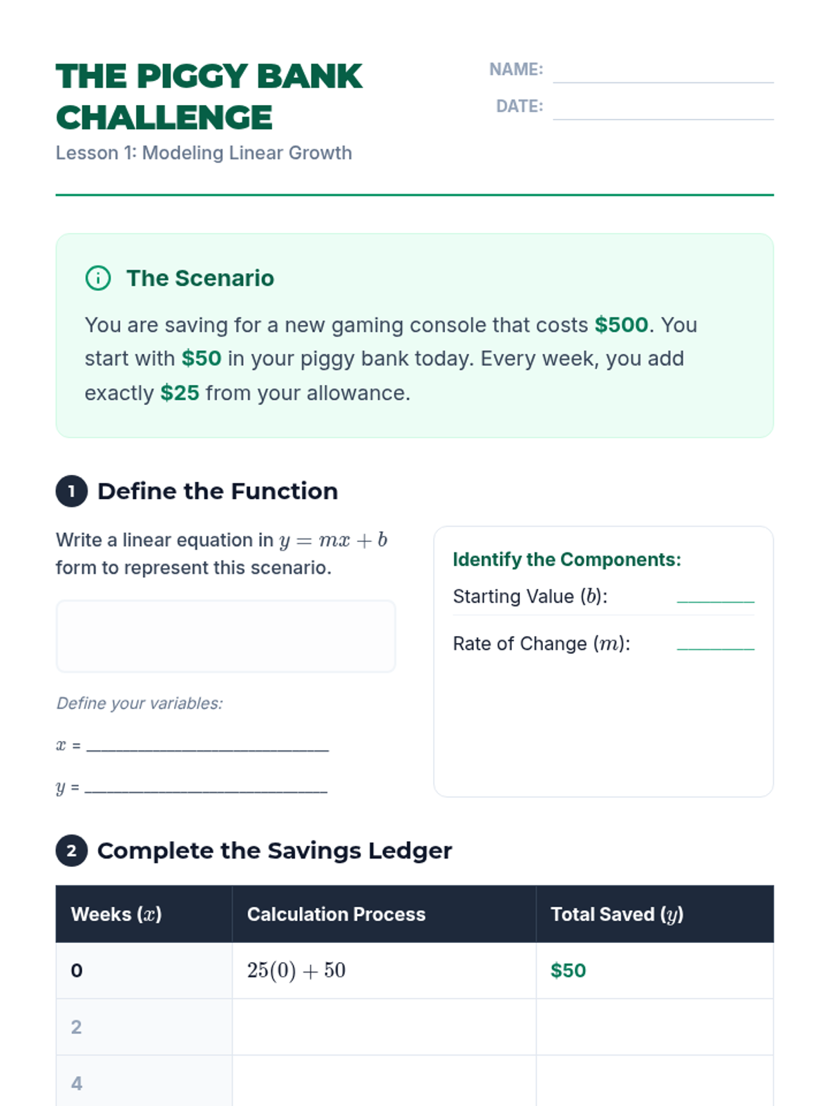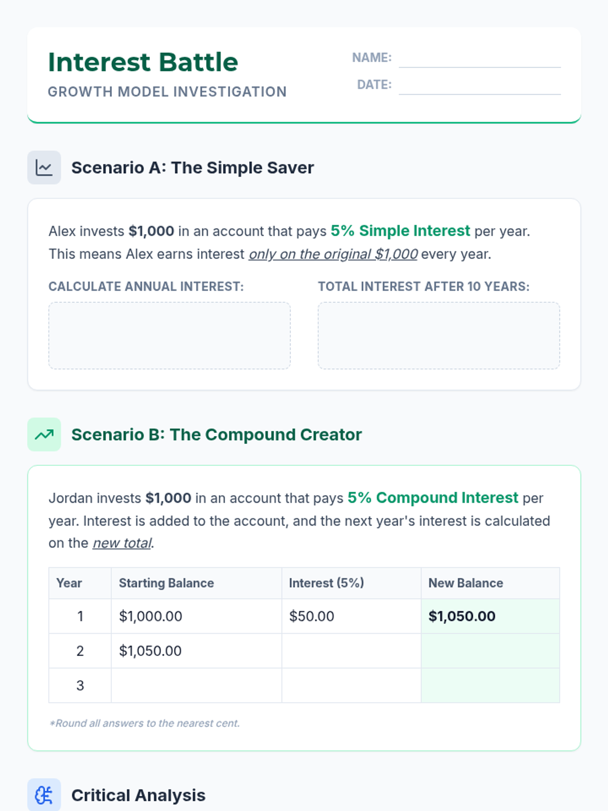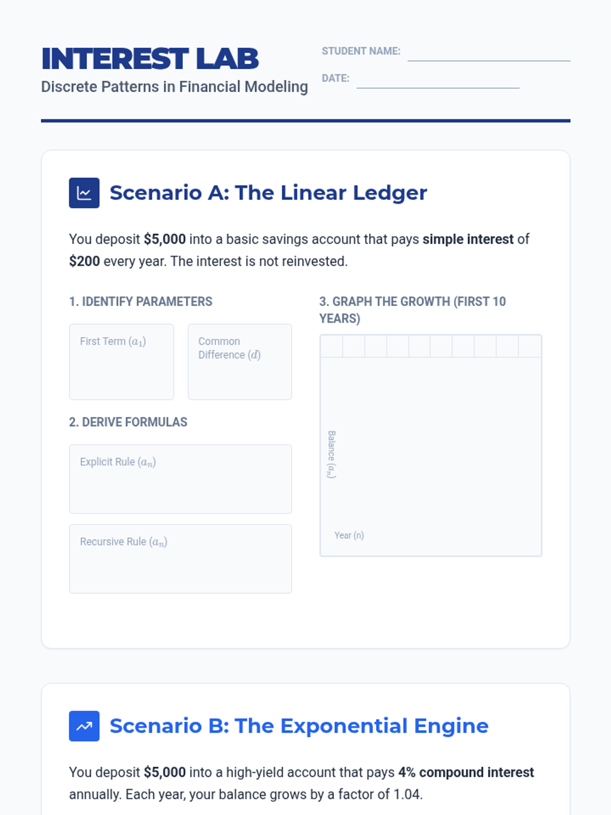 Students explore linear and exponential growth through personal finance, comparing simple and compound interest to make informed decisions about saving and debt.