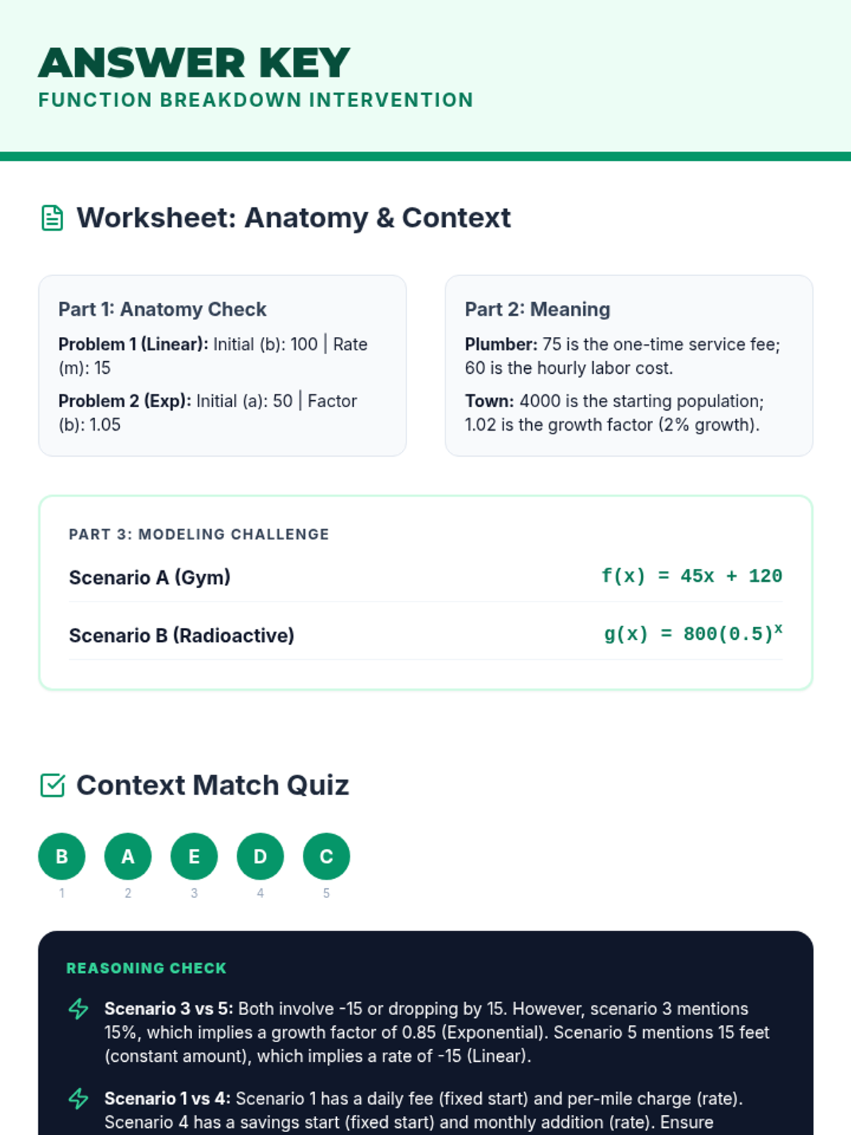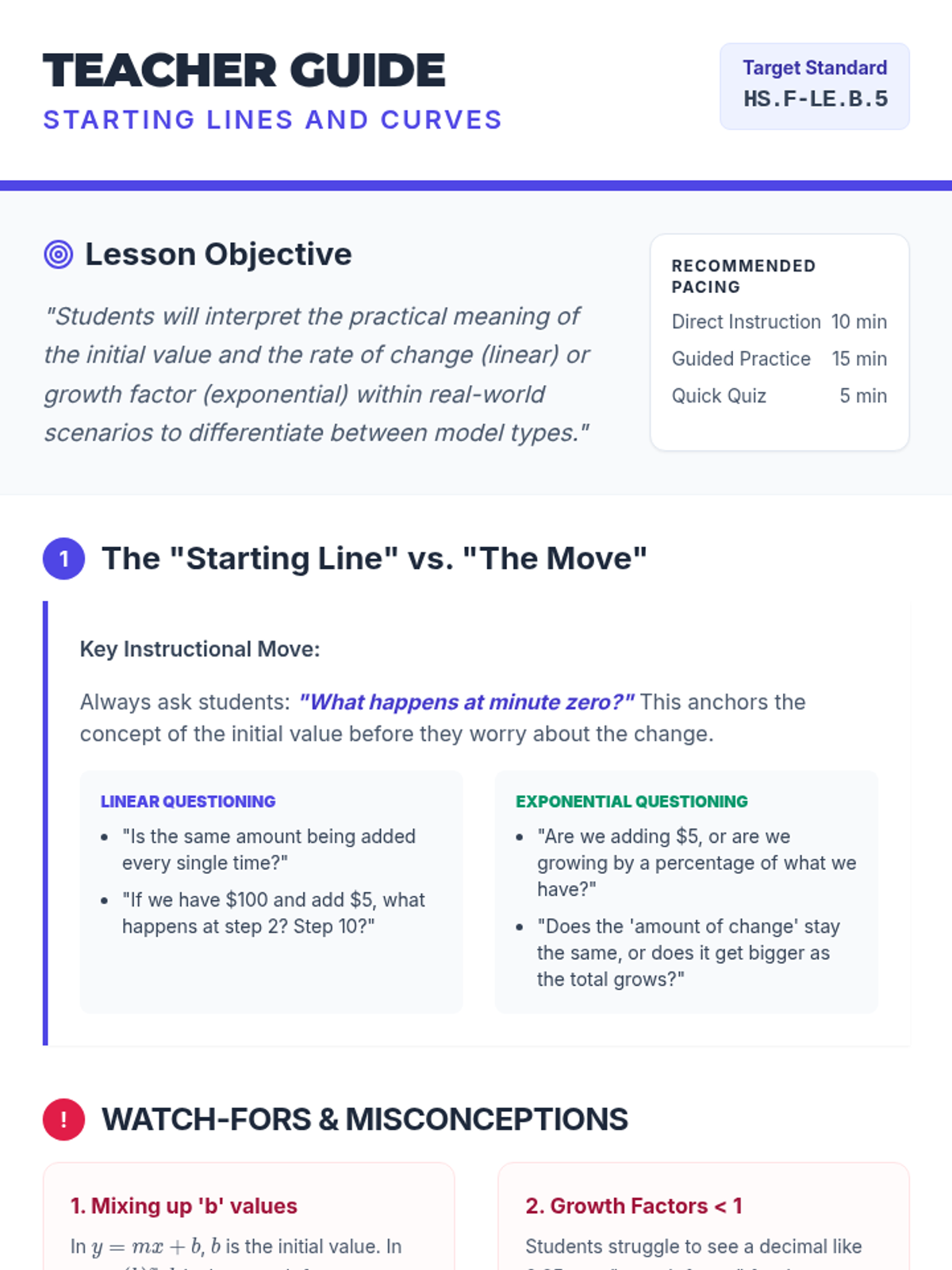 A targeted intervention sequence for High School students to master interpreting initial values and rates of change or growth factors in linear and exponential contexts, aligned with Colorado standard HS.F-LE.B.5.