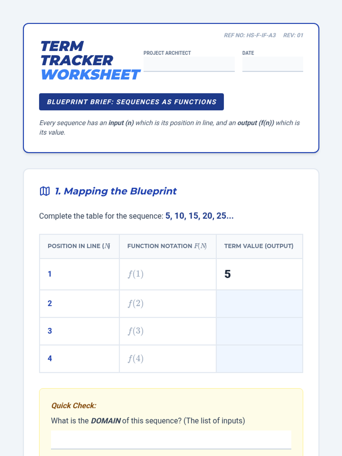 A comprehensive Tier 2 intervention sequence designed for high school students to master interpreting functions, including domain, range, key features, and real-world applications. The sequence uses a 'Blueprint' aesthetic to provide high-clarity, professional visuals that support conceptual understanding through scaffolded tasks.