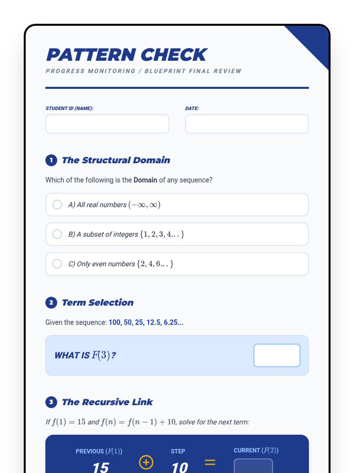 This sequence introduces students to arithmetic and geometric sequences, moving from visual patterns to formal algebraic formulas. Students explore the connections between sequences and linear or exponential functions, analyze complex non-standard patterns, and apply their knowledge in a culminating mastery assessment.