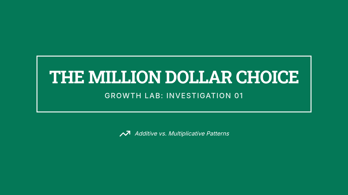 An inquiry-based exploration of growth rates, comparing linear, quadratic, and exponential patterns through real-world simulations, table analysis, and graphing. Students discover how constant addition, area growth, and constant multiplication create vastly different outcomes over time.