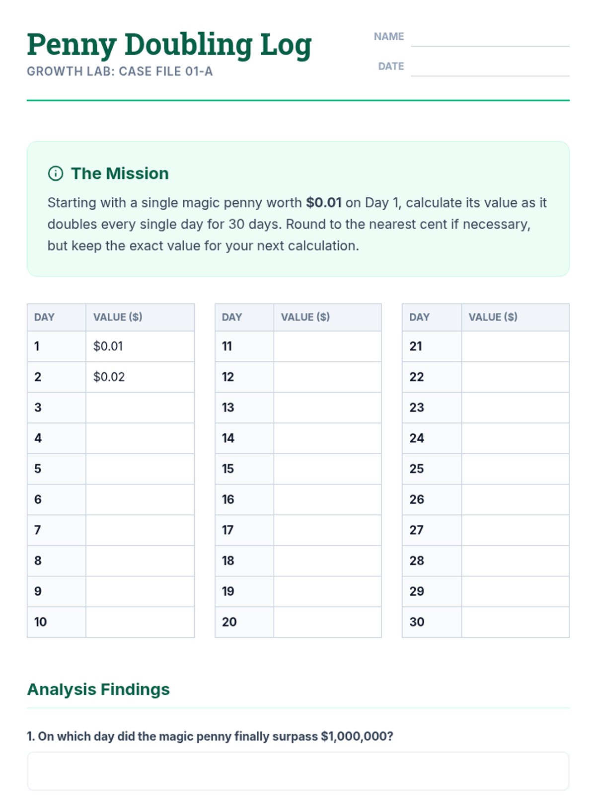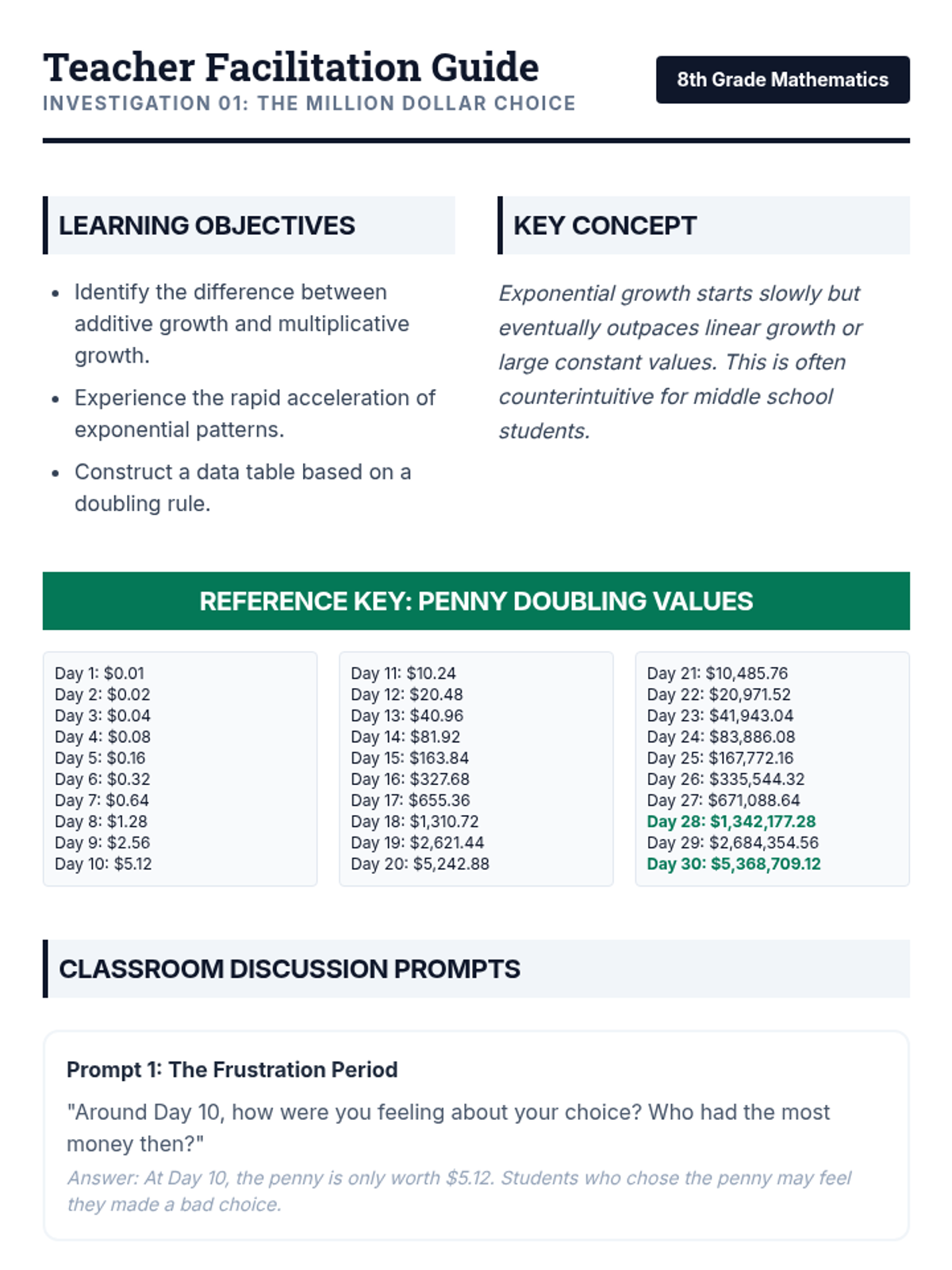 An inquiry-based exploration of additive vs. multiplicative growth, moving from a classic penny-doubling dilemma to formal identification of linear and exponential functions using tables and graphs.
