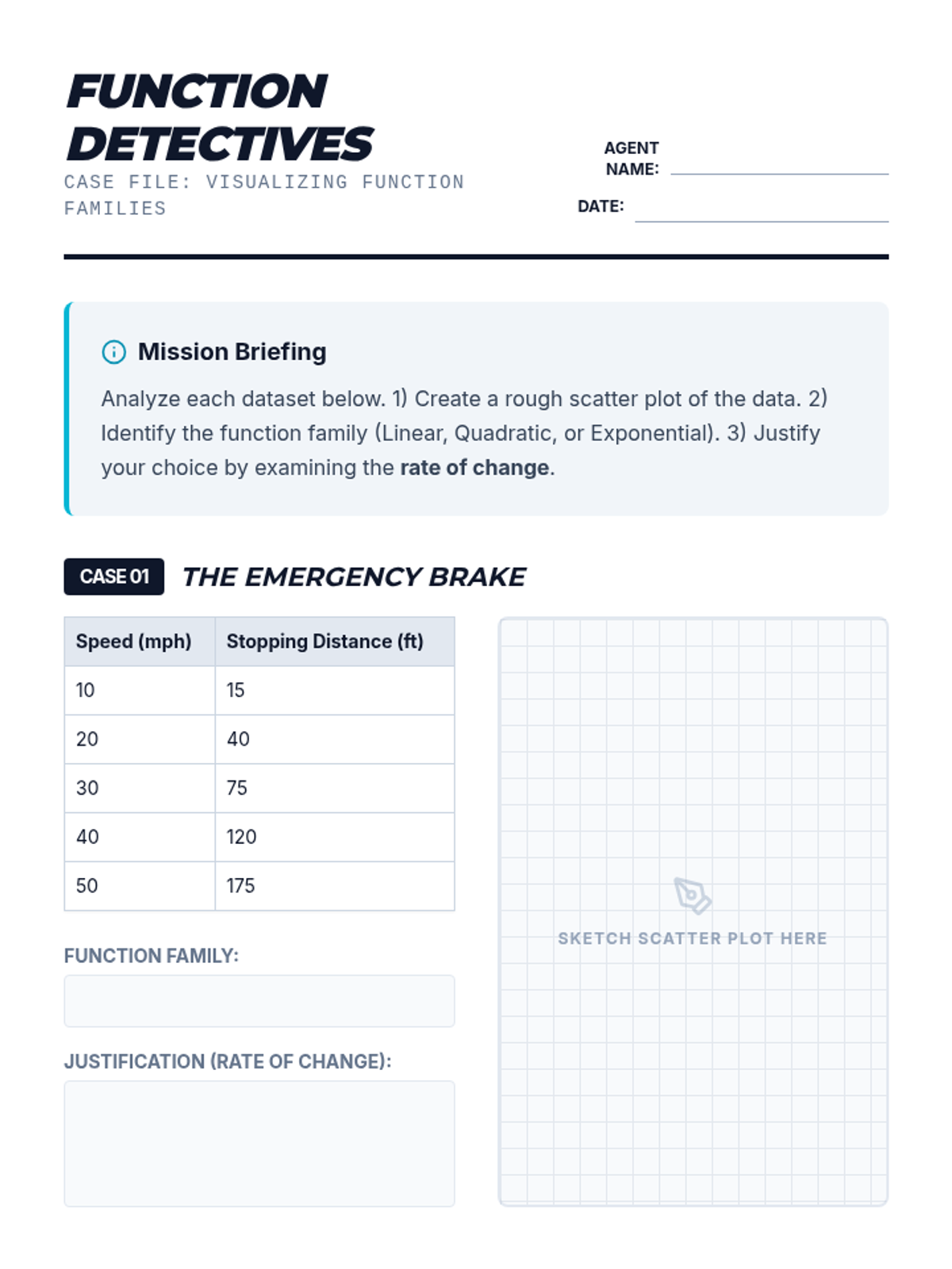 Students assume the role of data analysts to interpret complex real-world datasets related to economics, population dynamics, and environmental science. They identify function families, construct algebraic models using regression, evaluate 'goodness of fit' via residuals, and apply their models for predictions while critically analyzing domain limitations.