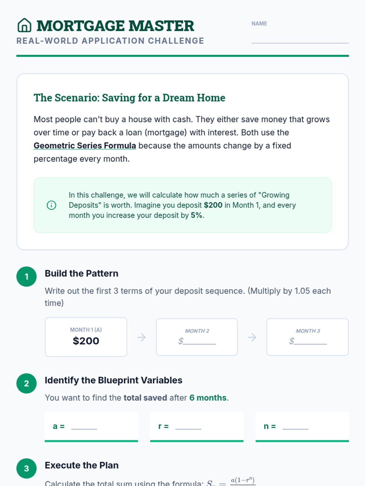 A comprehensive unit on arithmetic and geometric sequences and series, focusing on identifying patterns, deriving summation formulas, and applying these concepts to financial modeling and real-world growth.