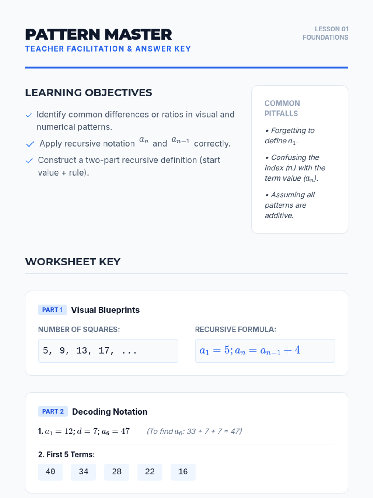 This sequence transitions students from intuitive pattern recognition to the formal algebraic modeling of arithmetic and geometric sequences. Students will derive recursive and explicit formulas and apply them to real-world scenarios like finance.