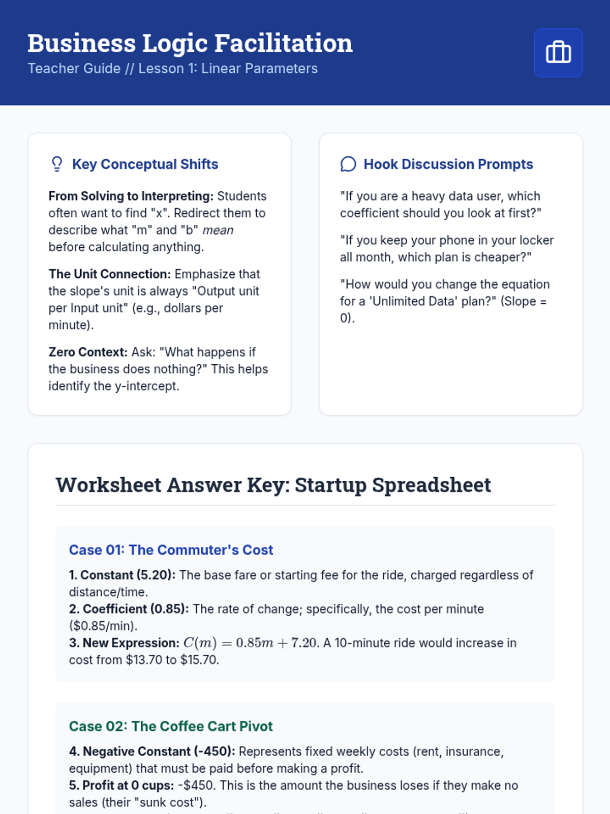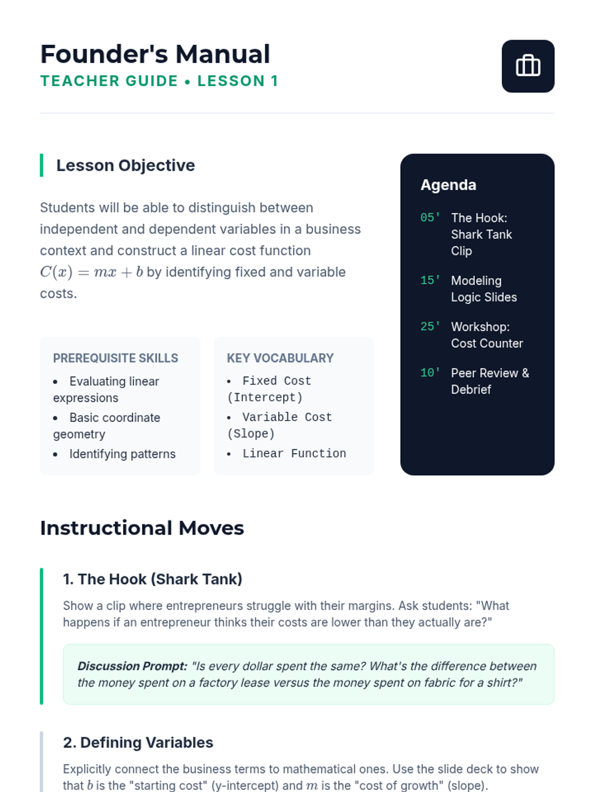 In this project-based sequence, 9th-grade students act as entrepreneurs to model the financial viability of a business startup using algebraic functions. They progress from linear cost models to revenue and profit functions, culminating in break-even analysis and strategic optimization.