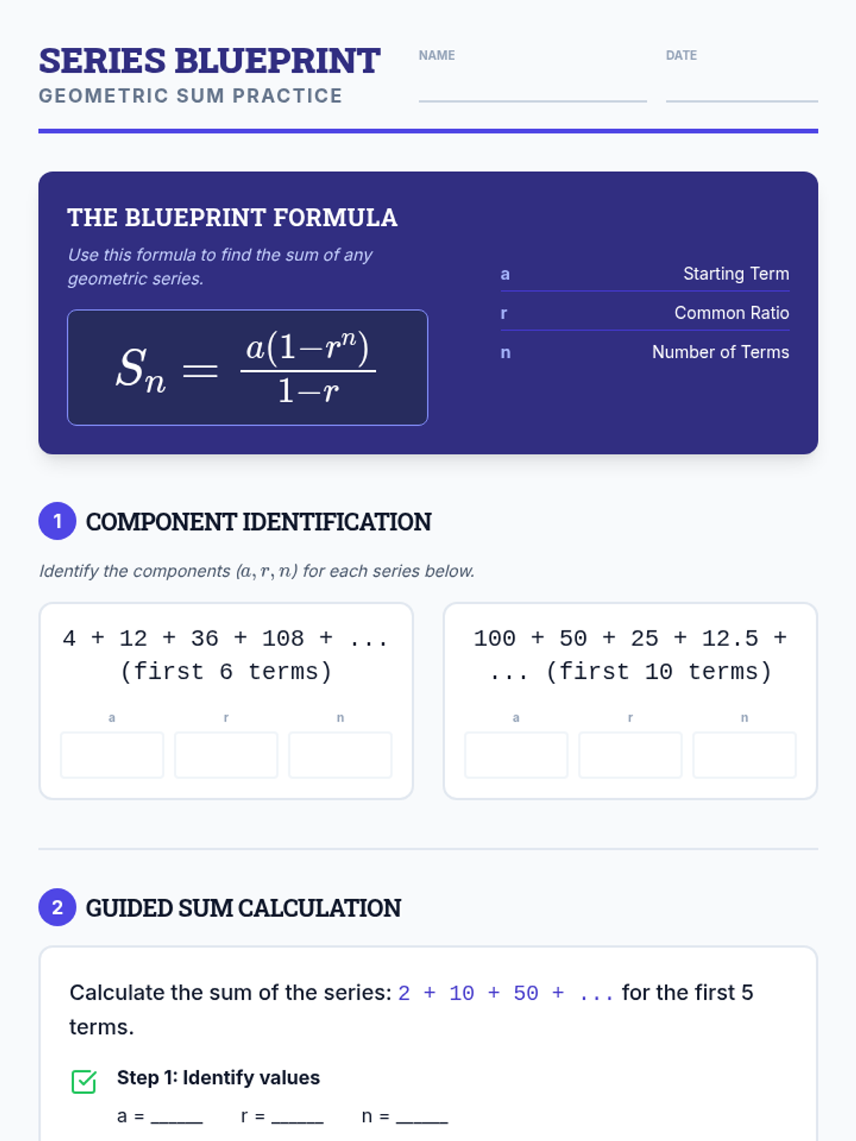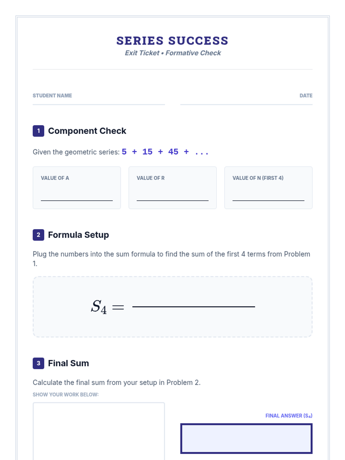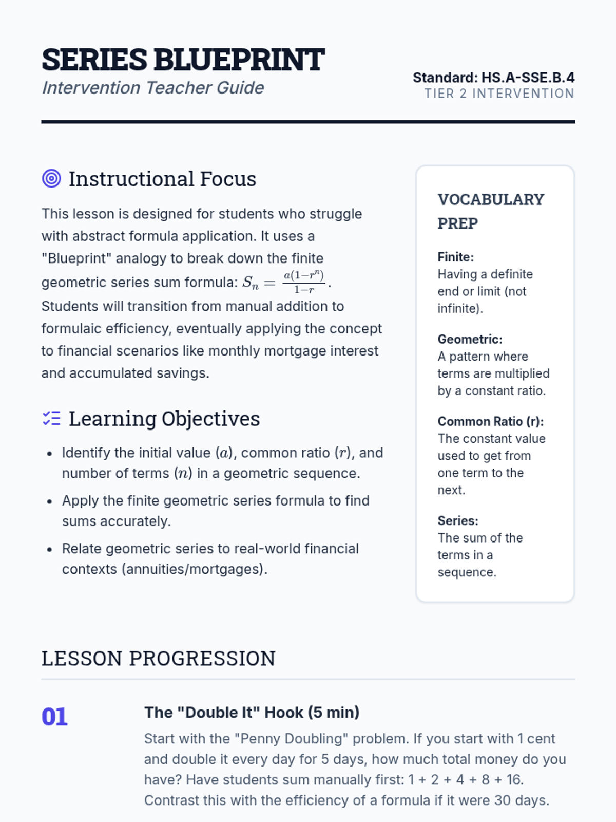 A targeted intervention sequence focusing on the derivation and application of the geometric series sum formula for high school algebra students requiring Tier 2 support.