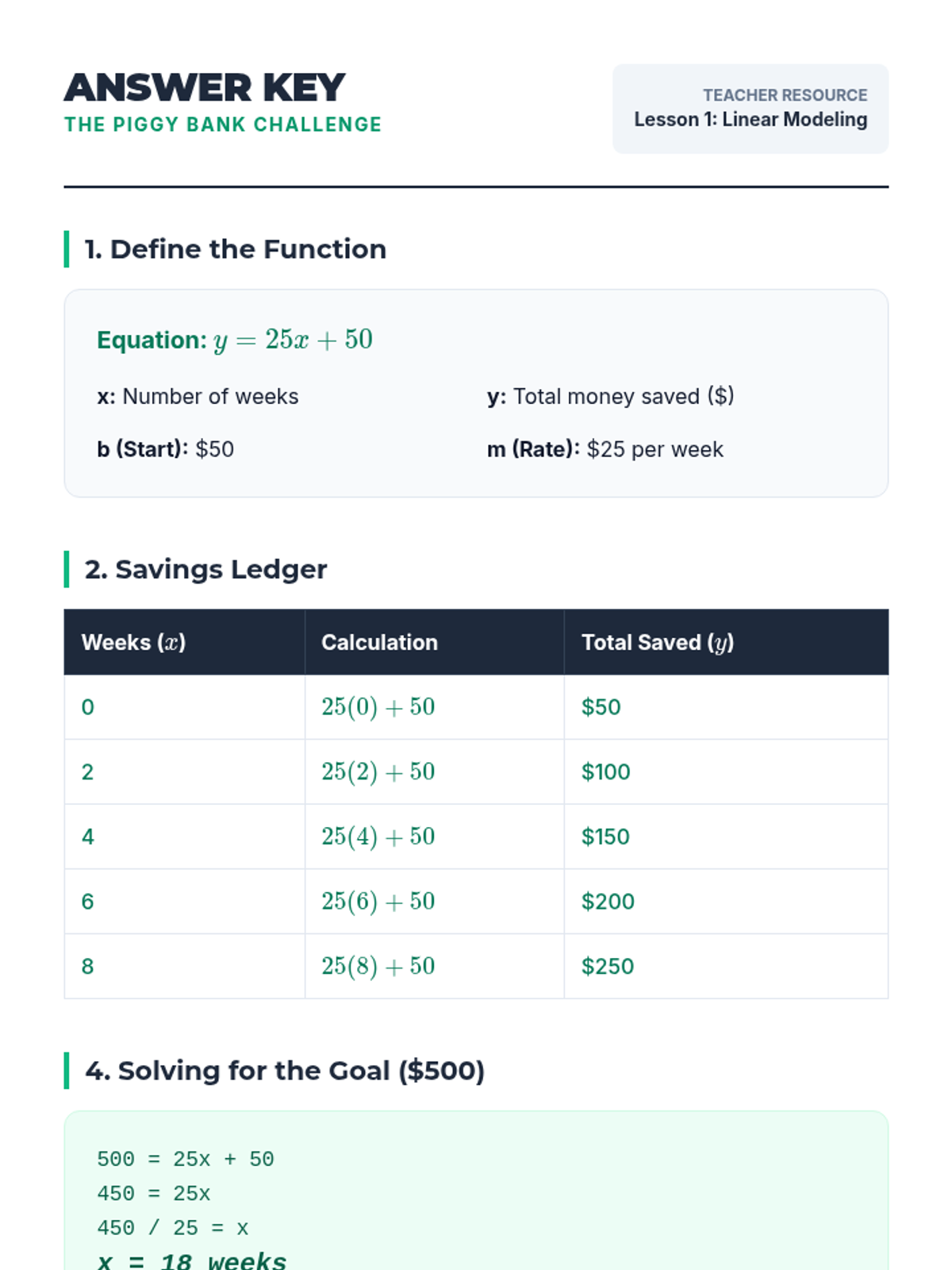 This financial literacy-themed sequence teaches 8th-grade students to compare linear and exponential growth rates. Students act as financial consultants, analyzing investment, debt, and depreciation scenarios to understand function dominance and long-term behavior.