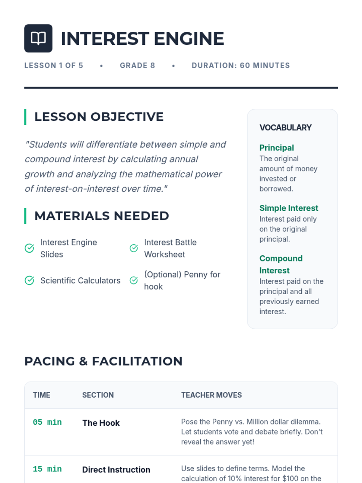 A comprehensive deep dive into the mathematical mechanics of money. Students move from basic interest calculations to understanding the exponential power of compound interest, the impact of inflation, and the massive advantage of starting early.